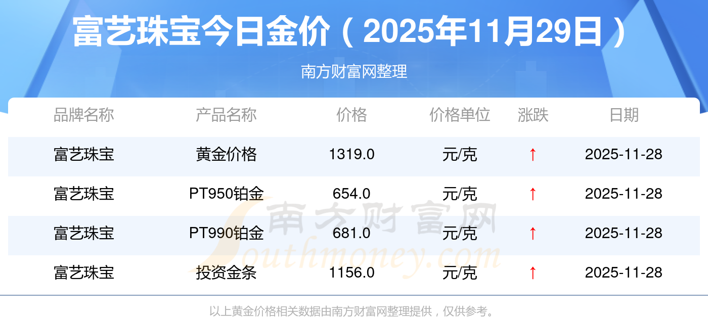 2025年11月29日富藝珠寶最新價格:黃金價格1321.0元/克,鉑金價格600.0元/克,銀條價格12.6元/克,黃金價格1321.0元/克,鉑金價格600.0元/克,金條價格(內(nèi)地)1207.0元/克,金飾價格(內(nèi)地)1321.0元/克,黃金飾品(香港)46370.0,鉑金飾品(香港)13970.0,金條金價(香港)41860.0,投資金條1296.0元/克。
