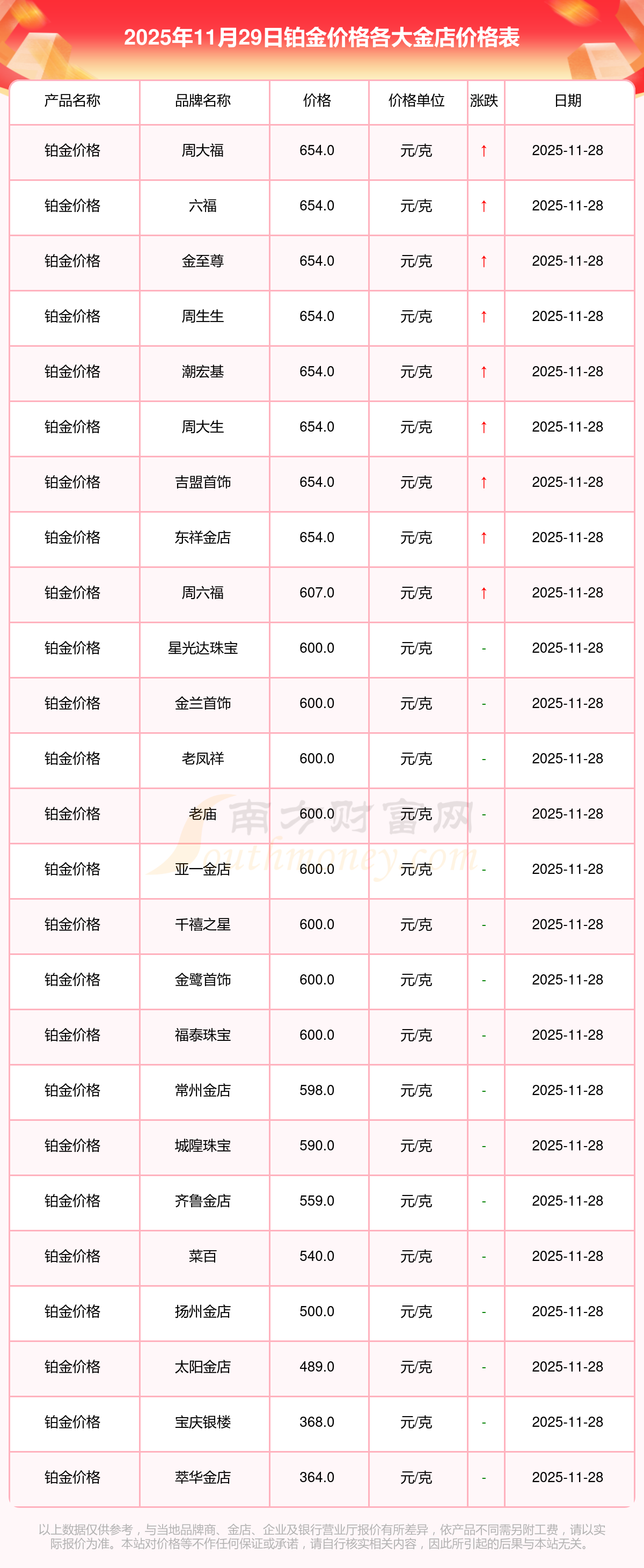 2025年11月29日,星光達(dá)珠寶、星光達(dá)珠寶、寶泉錢幣、金蘭首飾、金蘭首飾、謝瑞麟、謝瑞麟、謝瑞麟、謝瑞麟、謝瑞麟、金銀街等各大金店品牌鉑金價(jià)格今日價(jià)格如下:星光達(dá)珠寶1321.0元/克、星光達(dá)珠寶600.0元/克、寶泉錢幣12.6元/克、金蘭首飾1321.0元/克、金蘭首飾600.0元/克、謝瑞麟1207.0元/克、謝瑞麟1321.0元/克、謝瑞麟46370.0、謝瑞麟13970.0、謝瑞麟41860.0、金銀街1296.0元/克。