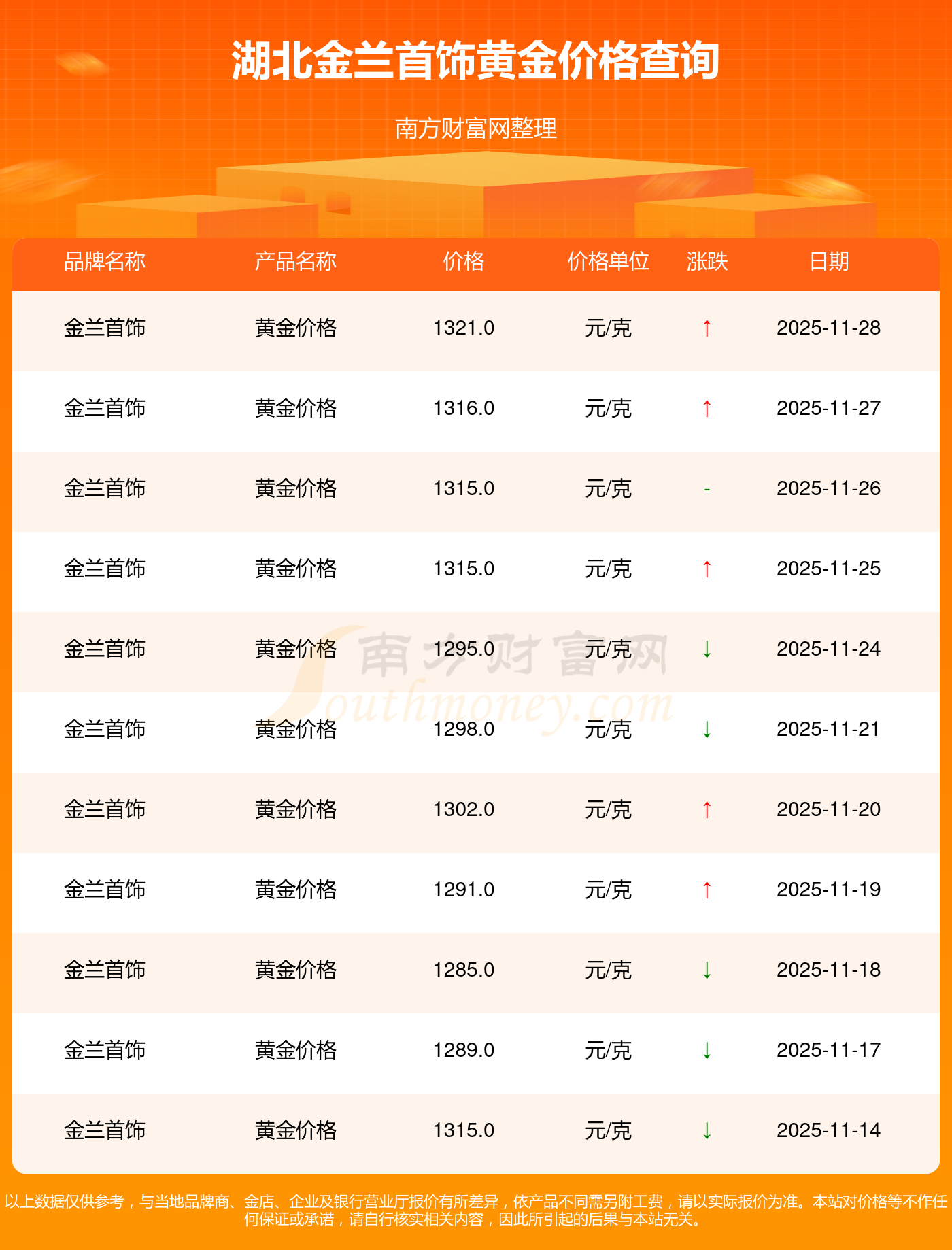 2025年11月29日,湖北金蘭首飾黃金價(jià)格每克的價(jià)值量定格在1321.0元/克。