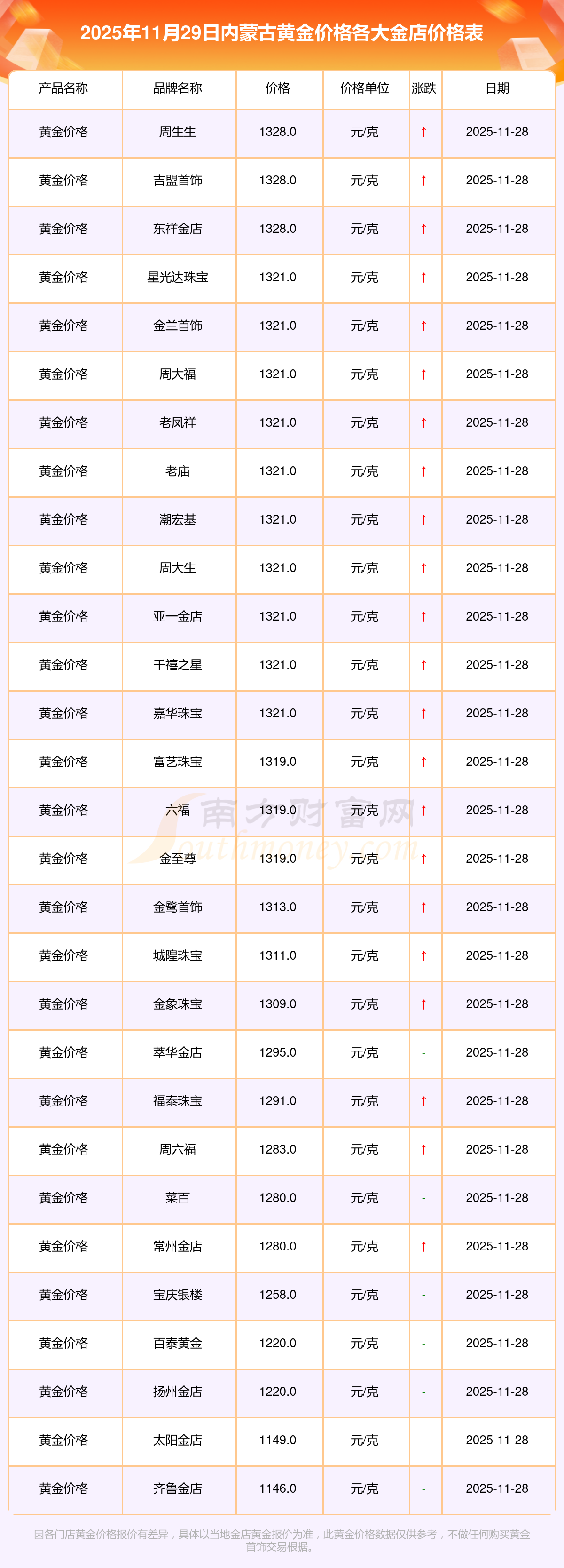 今天是2025年11月29日,內(nèi)蒙古星光達(dá)珠寶、星光達(dá)珠寶、寶泉錢幣、金蘭首飾、金蘭首飾、謝瑞麟、謝瑞麟、謝瑞麟、謝瑞麟、謝瑞麟、金銀街等各大金店品牌黃金價(jià)格最新價(jià)格如下:星光達(dá)珠寶1321.0元/克、星光達(dá)珠寶600.0元/克、寶泉錢幣12.6元/克、金蘭首飾1321.0元/克、金蘭首飾600.0元/克、謝瑞麟1207.0元/克、謝瑞麟1321.0元/克、謝瑞麟46370.0、謝瑞麟13970.0、謝瑞麟41860.0、金銀街1296.0元/克。