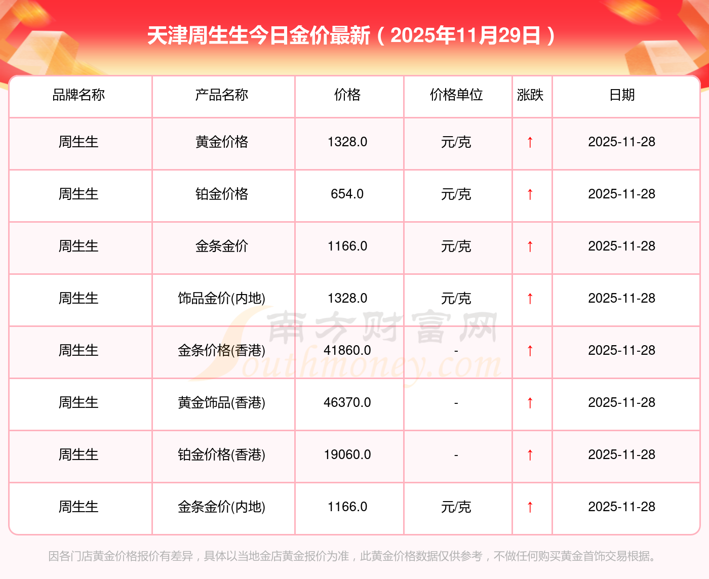 想知道今日黃金價格,目前黃金一克的價錢是多少呀?2025年11月29日天津周生生黃金的單價,一克為多少?黃金價格1321.0元/克,鉑金價格600.0元/克,銀條價格12.6元/克,黃金價格1321.0元/克,鉑金價格600.0元/克,金條價格(內(nèi)地)1207.0元/克,金飾價格(內(nèi)地)1321.0元/克,黃金飾品(香港)46370.0,鉑金飾品(香港)13970.0,金條金價(香港)41860.0,投資金條1296.0元/克。