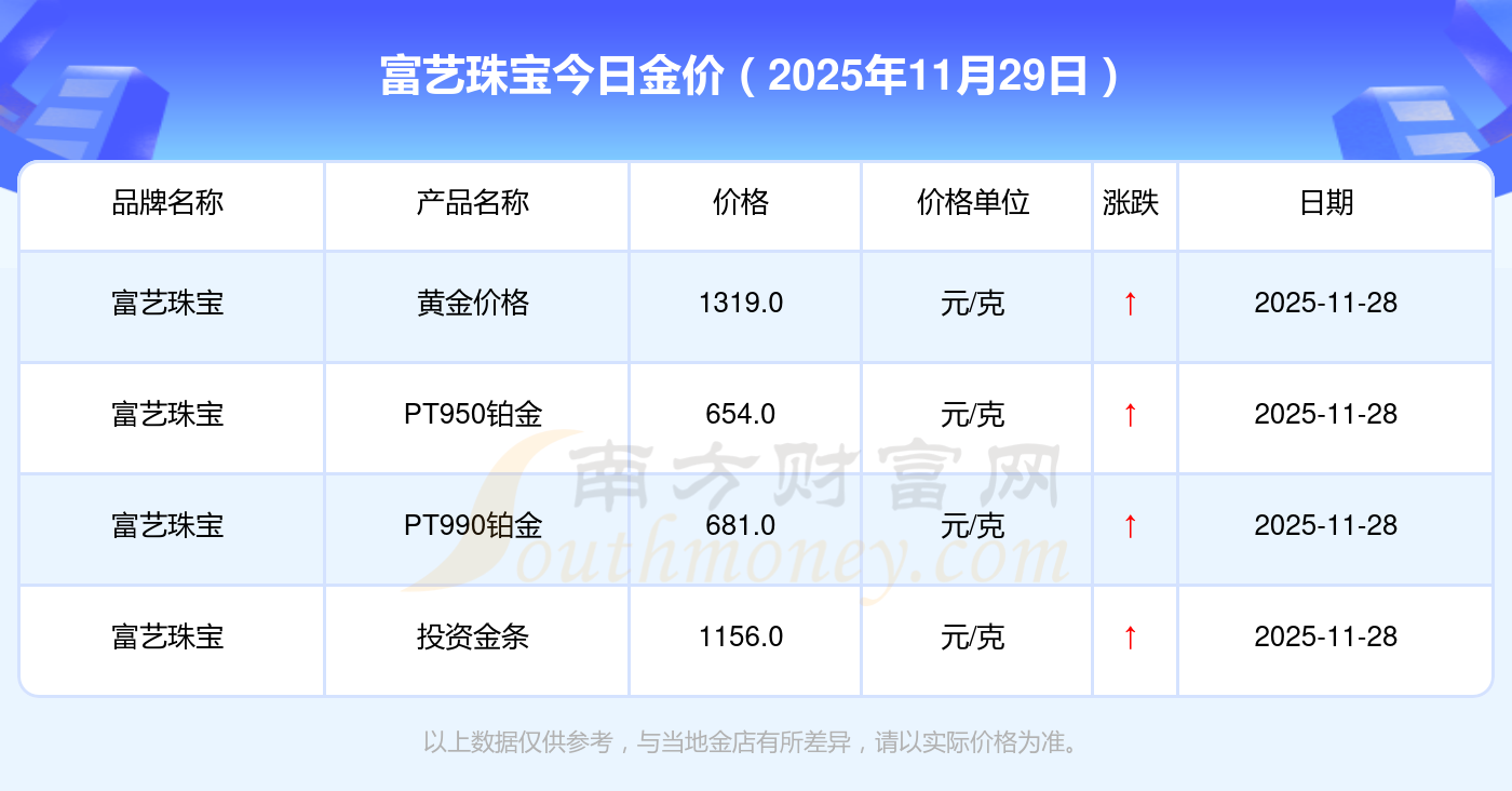 2025年11月29日富藝珠寶最新價(jià)格:黃金價(jià)格1321.0元/克,鉑金價(jià)格600.0元/克,銀條價(jià)格12.6元/克,黃金價(jià)格1321.0元/克,鉑金價(jià)格600.0元/克,金條價(jià)格(內(nèi)地)1207.0元/克,金飾價(jià)格(內(nèi)地)1321.0元/克,黃金飾品(香港)46370.0,鉑金飾品(香港)13970.0,金條金價(jià)(香港)41860.0,投資金條1296.0元/克。