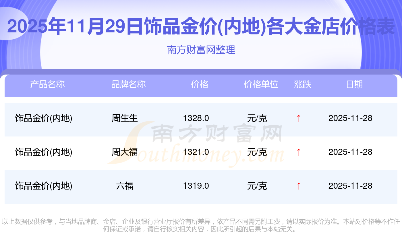 今天是2025年11月29日,星光達(dá)珠寶、星光達(dá)珠寶、寶泉錢幣、金蘭首飾、金蘭首飾、謝瑞麟、謝瑞麟、謝瑞麟、謝瑞麟、謝瑞麟、金銀街等各大金店品牌飾品金價(jià)(內(nèi)地)最新價(jià)格如下:星光達(dá)珠寶1321.0元/克、星光達(dá)珠寶600.0元/克、寶泉錢幣12.6元/克、金蘭首飾1321.0元/克、金蘭首飾600.0元/克、謝瑞麟1207.0元/克、謝瑞麟1321.0元/克、謝瑞麟46370.0、謝瑞麟13970.0、謝瑞麟41860.0、金銀街1296.0元/克。