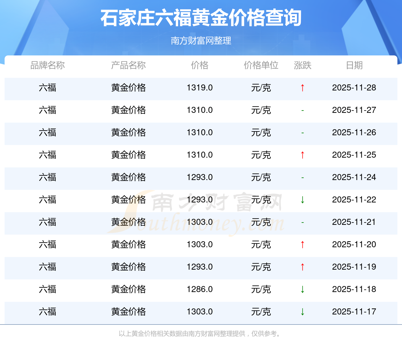 今日(2025年11月29日),石家莊六福黃金價格每克的價值為1319.0元/克。