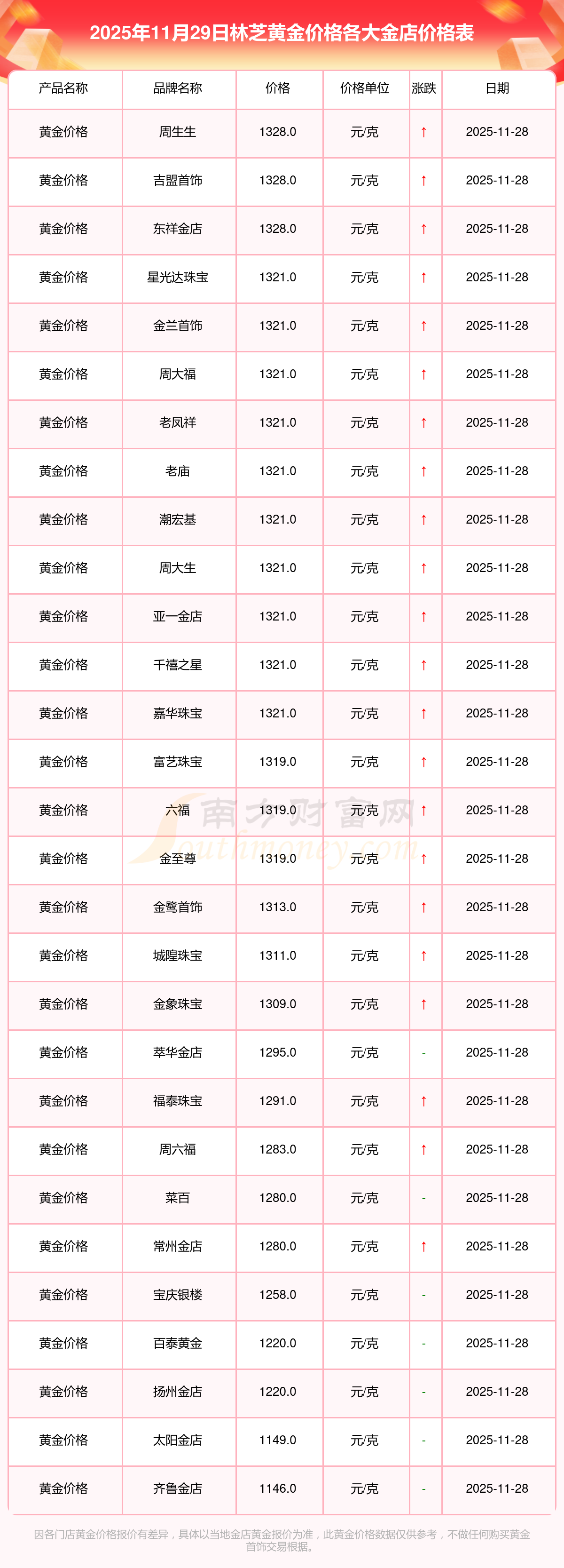 今天是2025年11月29日,林芝星光達(dá)珠寶、星光達(dá)珠寶、寶泉錢幣、金蘭首飾、金蘭首飾、謝瑞麟、謝瑞麟、謝瑞麟、謝瑞麟、謝瑞麟、金銀街等各大金店品牌黃金價格最新價格如下:星光達(dá)珠寶1321.0元/克、星光達(dá)珠寶600.0元/克、寶泉錢幣12.6元/克、金蘭首飾1321.0元/克、金蘭首飾600.0元/克、謝瑞麟1207.0元/克、謝瑞麟1321.0元/克、謝瑞麟46370.0、謝瑞麟13970.0、謝瑞麟41860.0、金銀街1296.0元/克。