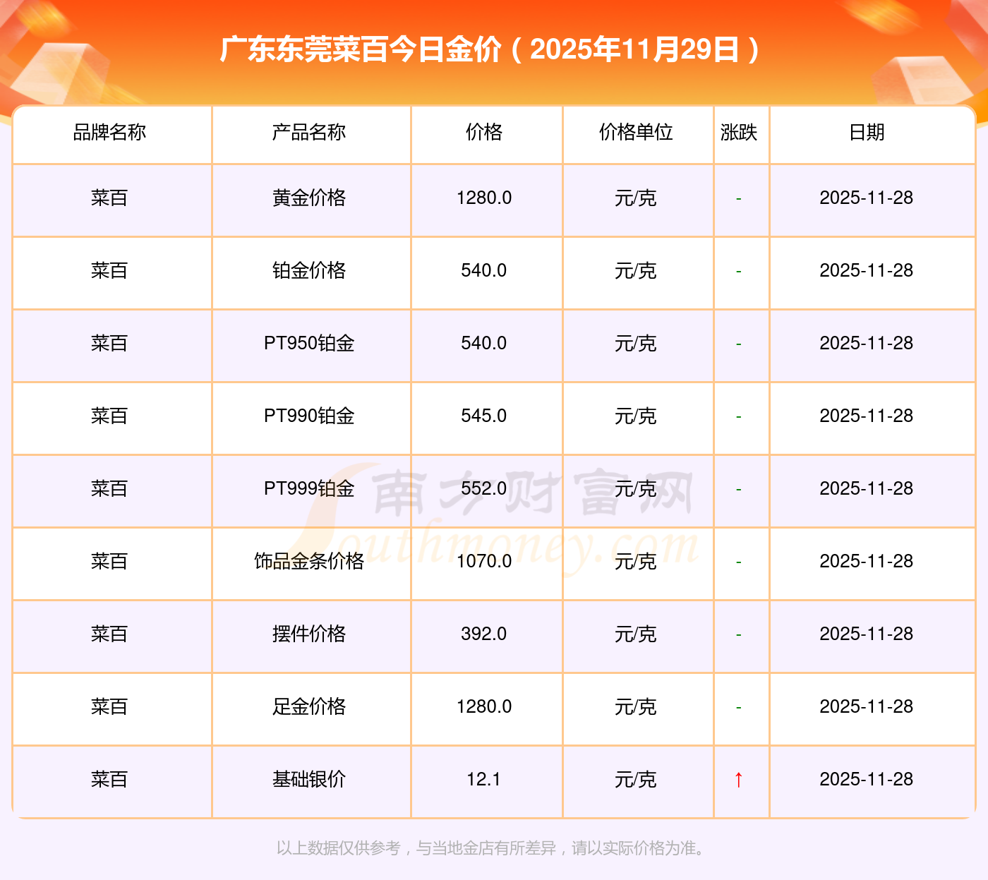 以上數(shù)據(jù)僅供參考,與當(dāng)?shù)仄放粕獭⒔鸬、企業(yè)及銀行營(yíng)業(yè)廳報(bào)價(jià)有所差異,依產(chǎn)品不同需另附工費(fèi),請(qǐng)以實(shí)際報(bào)價(jià)為準(zhǔn)。本站對(duì)價(jià)格等不作任何保證或承諾,請(qǐng)自行核實(shí)相關(guān)內(nèi)容,因此所引起的后果與本站無關(guān)。