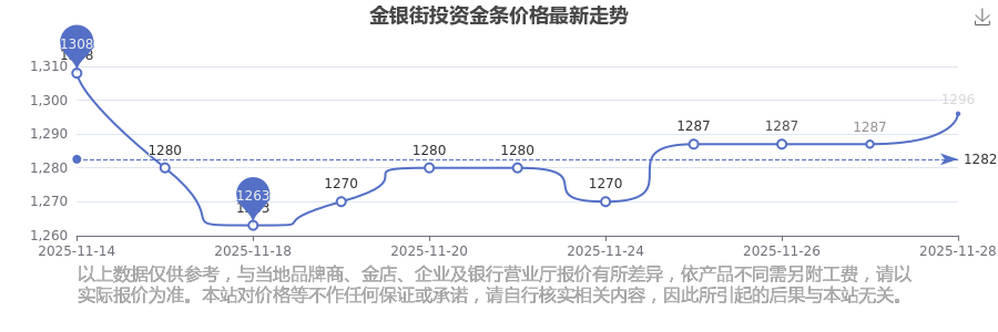 今日金銀街所公布的 投資金條最新價格為1296.0元/克。