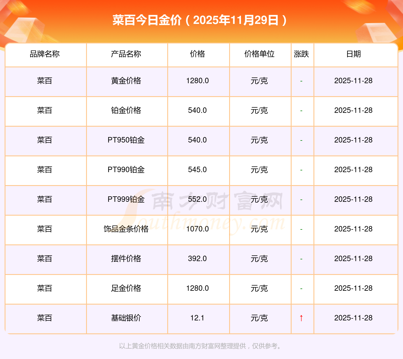 現(xiàn)在菜百黃金價(jià)格是多少錢1克_2025年菜百今日金價(jià)是多少錢一克,最新菜百查詢,2025年11月29日菜百PT990鉑金現(xiàn)在每克多少錢?最新菜百PT990鉑金報(bào)價(jià)公布,一起來看看吧!