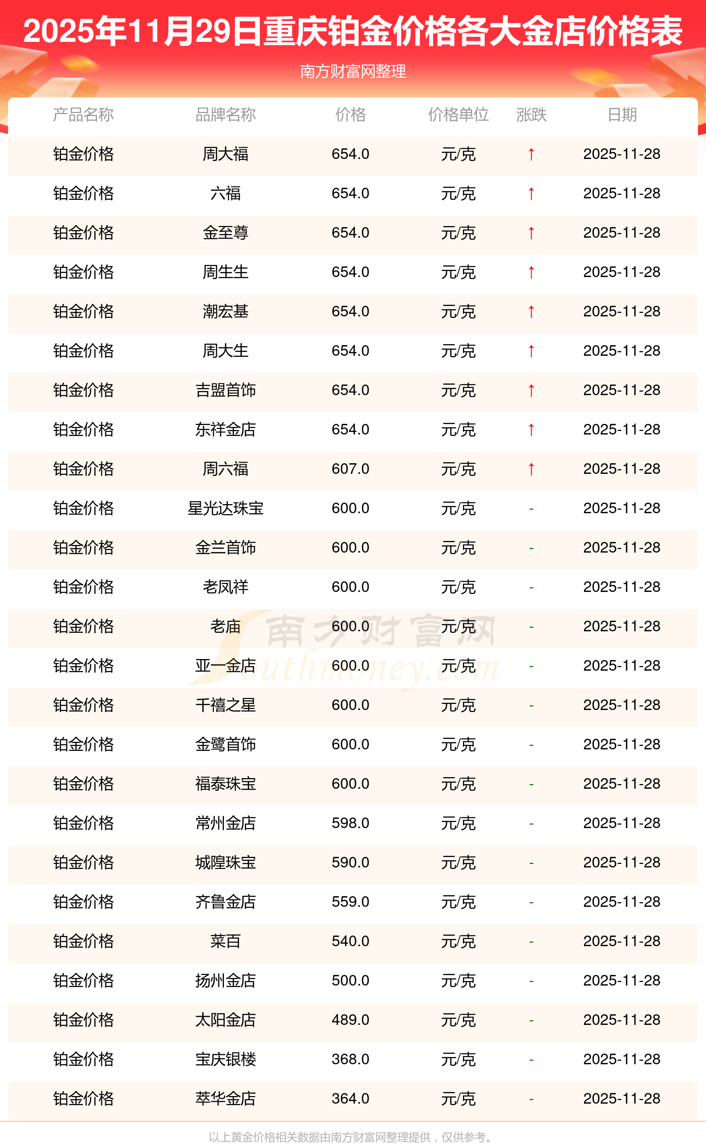 一、2025年11月29日重慶各大金店鉑金價格一克多少錢_鉑金價格今天價格查詢