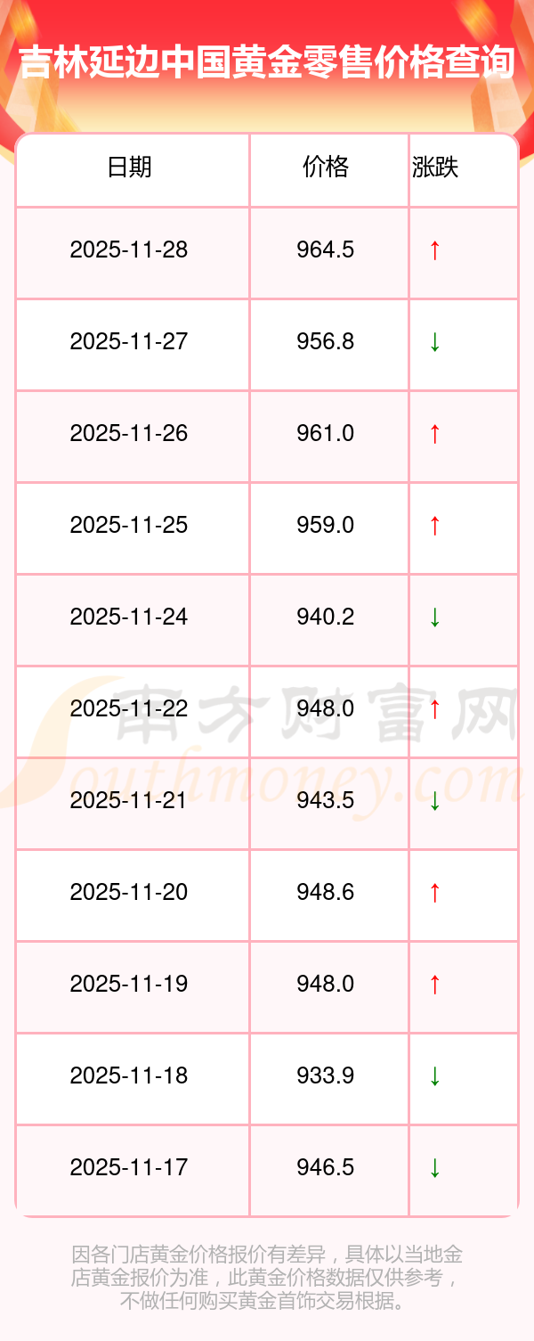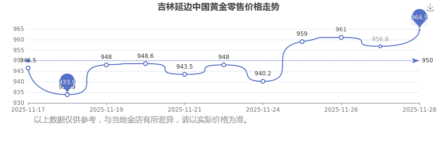 2025年11月29日這一天,吉林延邊中國黃金的零售價以 964.5元/克的價格售賣。