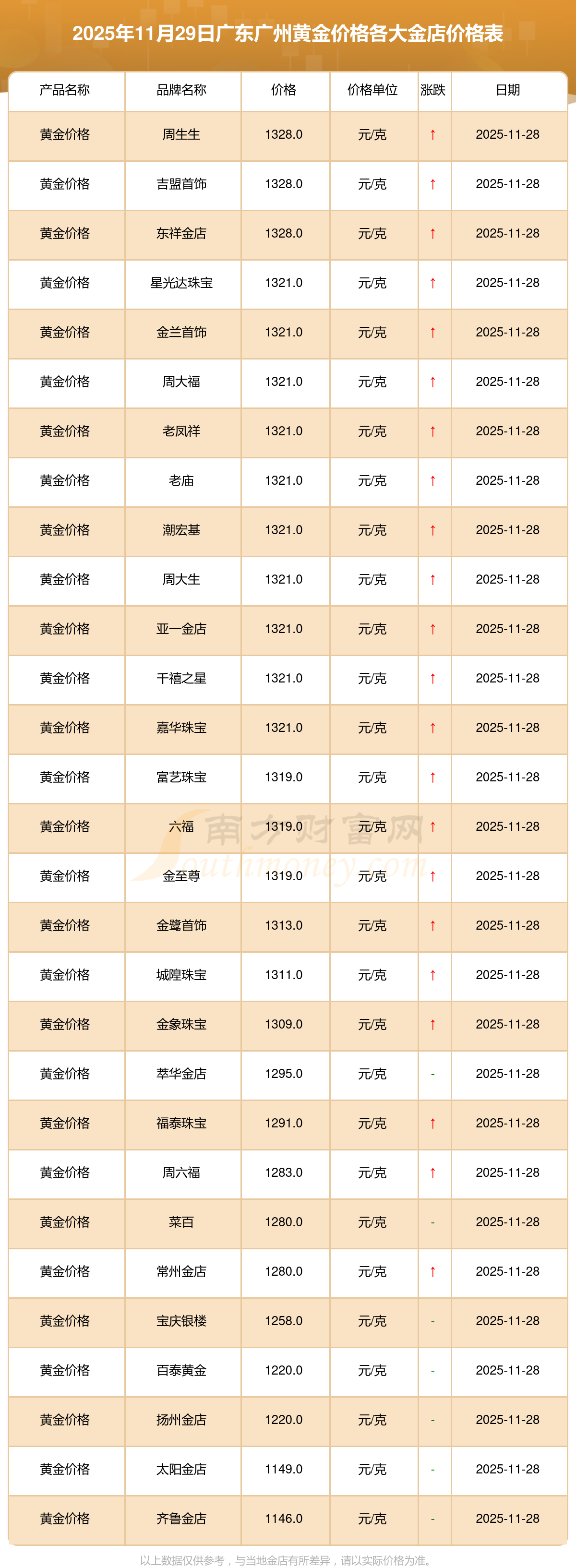 2025年11月29日廣東廣州各大金店黃金價格最新價格查詢來了:星光達(dá)珠寶1321.0元/克,星光達(dá)珠寶600.0元/克,寶泉錢幣12.6元/克,金蘭首飾1321.0元/克,金蘭首飾600.0元/克,謝瑞麟1207.0元/克,謝瑞麟1321.0元/克,謝瑞麟46370.0,謝瑞麟13970.0,謝瑞麟41860.0,金銀街1296.0元/克。