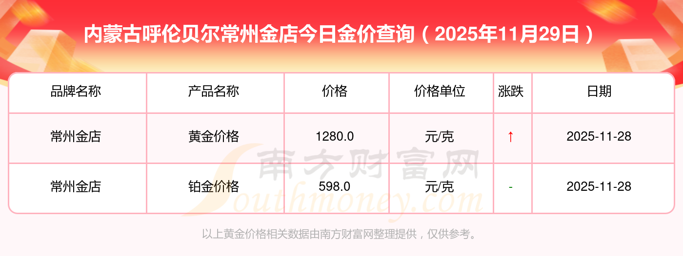 今日黃金價(jià)格查詢_現(xiàn)在金價(jià)黃金一克多少錢,黃金價(jià)格是多少錢一克? 2025年11月29日內(nèi)蒙古呼倫貝爾常州金店金價(jià)查詢:黃金價(jià)格1321.0元/克,鉑金價(jià)格600.0元/克,銀條價(jià)格12.6元/克,黃金價(jià)格1321.0元/克,鉑金價(jià)格600.0元/克,金條價(jià)格(內(nèi)地)1207.0元/克,金飾價(jià)格(內(nèi)地)1321.0元/克,黃金飾品(香港)46370.0,鉑金飾品(香港)13970.0,金條金價(jià)(香港)41860.0,投資金條1296.0元/克。