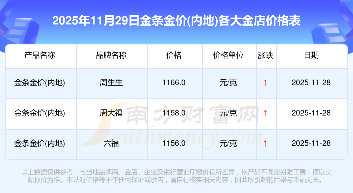 今天是2025年11月29日,星光達(dá)珠寶、星光達(dá)珠寶、寶泉錢幣、金蘭首飾、金蘭首飾、謝瑞麟、謝瑞麟、謝瑞麟、謝瑞麟、謝瑞麟、金銀街等各大金店品牌金條金價(jià)(內(nèi)地)最新價(jià)格如下:星光達(dá)珠寶1321.0元/克、星光達(dá)珠寶600.0元/克、寶泉錢幣12.6元/克、金蘭首飾1321.0元/克、金蘭首飾600.0元/克、謝瑞麟1207.0元/克、謝瑞麟1321.0元/克、謝瑞麟46370.0、謝瑞麟13970.0、謝瑞麟41860.0、金銀街1296.0元/克。