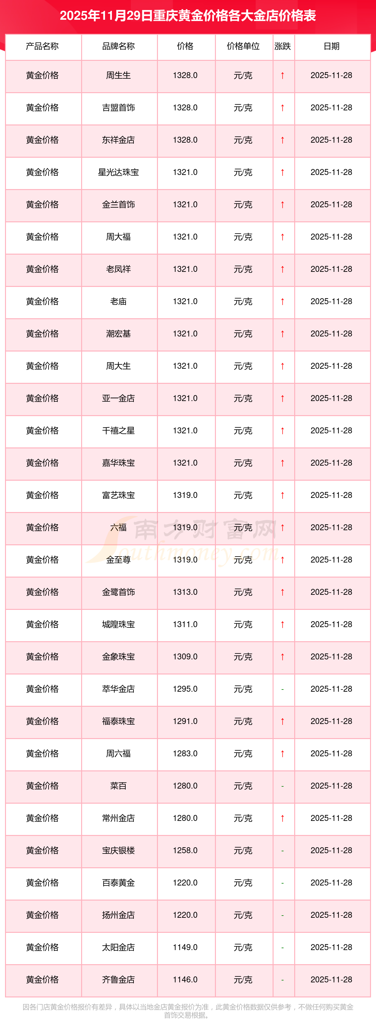 今天是2025年11月29日,重慶星光達(dá)珠寶、星光達(dá)珠寶、寶泉錢幣、金蘭首飾、金蘭首飾、謝瑞麟、謝瑞麟、謝瑞麟、謝瑞麟、謝瑞麟、金銀街等各大金店品牌黃金價(jià)格最新價(jià)格行情是這樣的:星光達(dá)珠寶1321.0元/克、星光達(dá)珠寶600.0元/克、寶泉錢幣12.6元/克、金蘭首飾1321.0元/克、金蘭首飾600.0元/克、謝瑞麟1207.0元/克、謝瑞麟1321.0元/克、謝瑞麟46370.0、謝瑞麟13970.0、謝瑞麟41860.0、金銀街1296.0元/克。