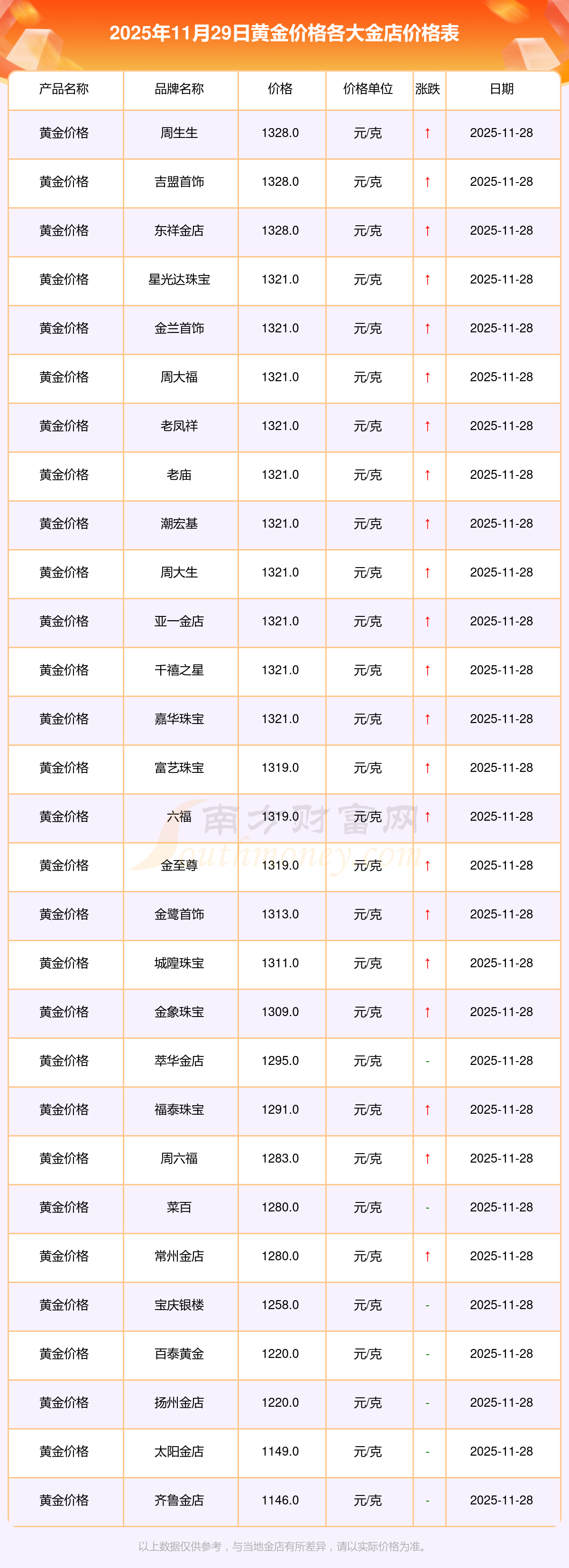 2025年11月29日,星光達珠寶、星光達珠寶、寶泉錢幣、金蘭首飾、金蘭首飾、謝瑞麟、謝瑞麟、謝瑞麟、謝瑞麟、謝瑞麟、金銀街等各大金店品牌黃金價格今日價格如下:星光達珠寶1321.0元/克、星光達珠寶600.0元/克、寶泉錢幣12.6元/克、金蘭首飾1321.0元/克、金蘭首飾600.0元/克、謝瑞麟1207.0元/克、謝瑞麟1321.0元/克、謝瑞麟46370.0、謝瑞麟13970.0、謝瑞麟41860.0、金銀街1296.0元/克。