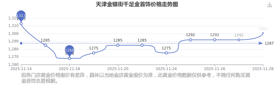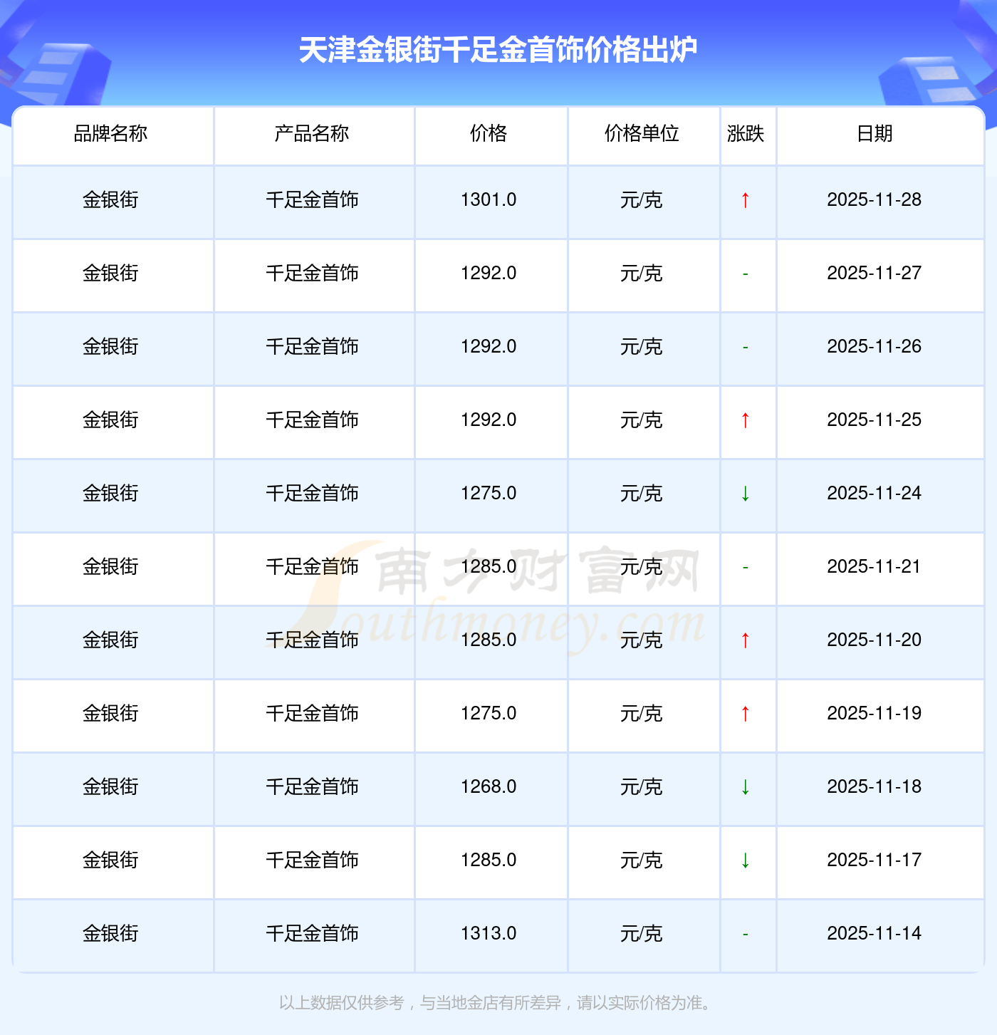 (2025年11月29日)今日天津金銀街千足金首飾價格是1301.0元/克。