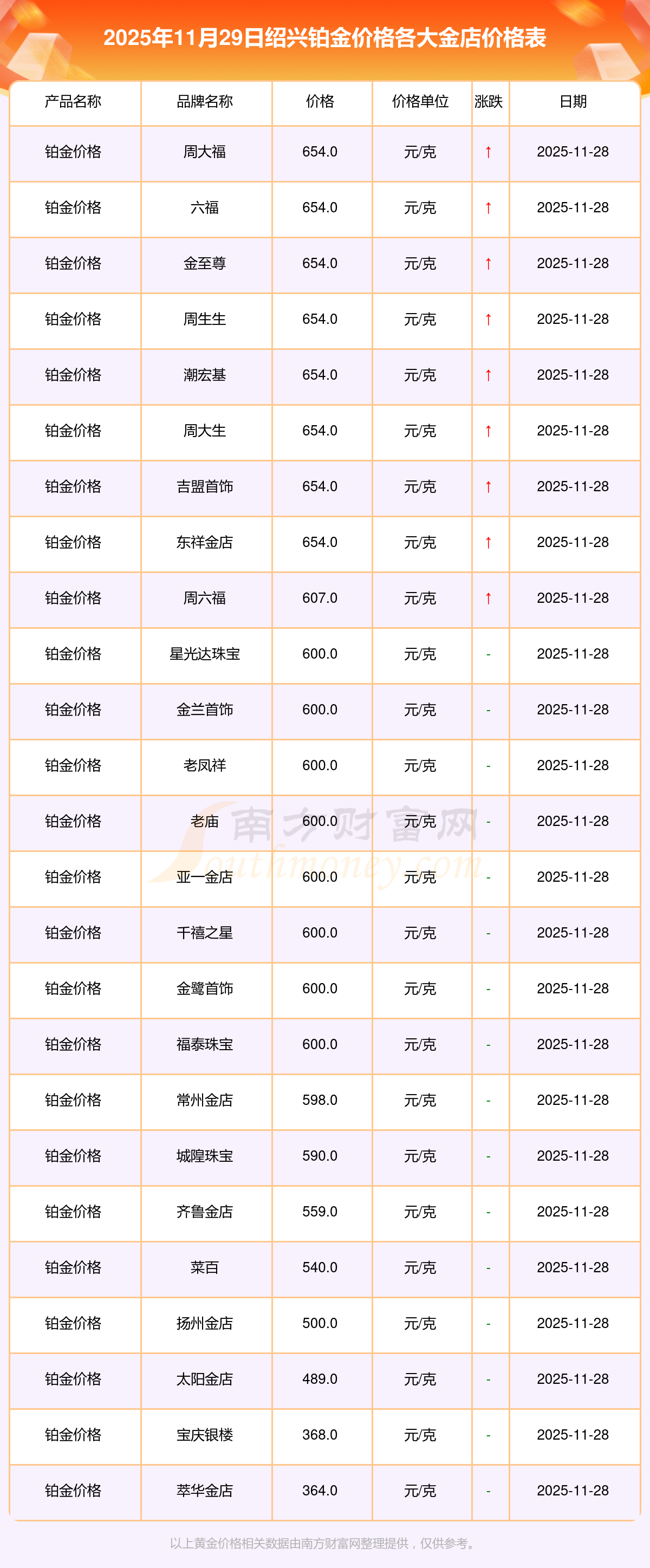 2025年11月29日,紹興星光達(dá)珠寶、星光達(dá)珠寶、寶泉錢幣、金蘭首飾、金蘭首飾、謝瑞麟、謝瑞麟、謝瑞麟、謝瑞麟、謝瑞麟、金銀街等各大金店品牌鉑金價格今日價格行情最新來了:星光達(dá)珠寶1321.0元/克、星光達(dá)珠寶600.0元/克、寶泉錢幣12.6元/克、金蘭首飾1321.0元/克、金蘭首飾600.0元/克、謝瑞麟1207.0元/克、謝瑞麟1321.0元/克、謝瑞麟46370.0、謝瑞麟13970.0、謝瑞麟41860.0、金銀街1296.0元/克。