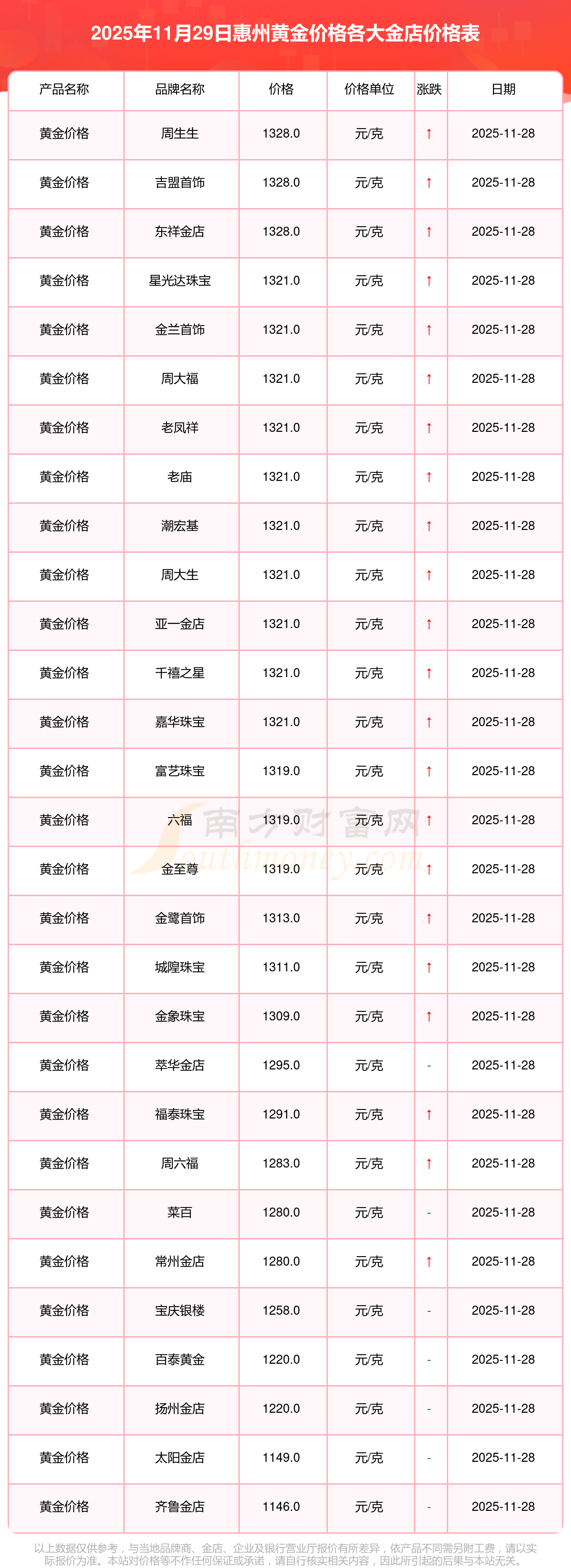 因各門(mén)店黃金價(jià)格報(bào)價(jià)有差異,具體以當(dāng)?shù)亟鸬挈S金報(bào)價(jià)為準(zhǔn),此黃金價(jià)格數(shù)據(jù)僅供參考,不做任何購(gòu)買(mǎi)黃金首飾交易根據(jù)。