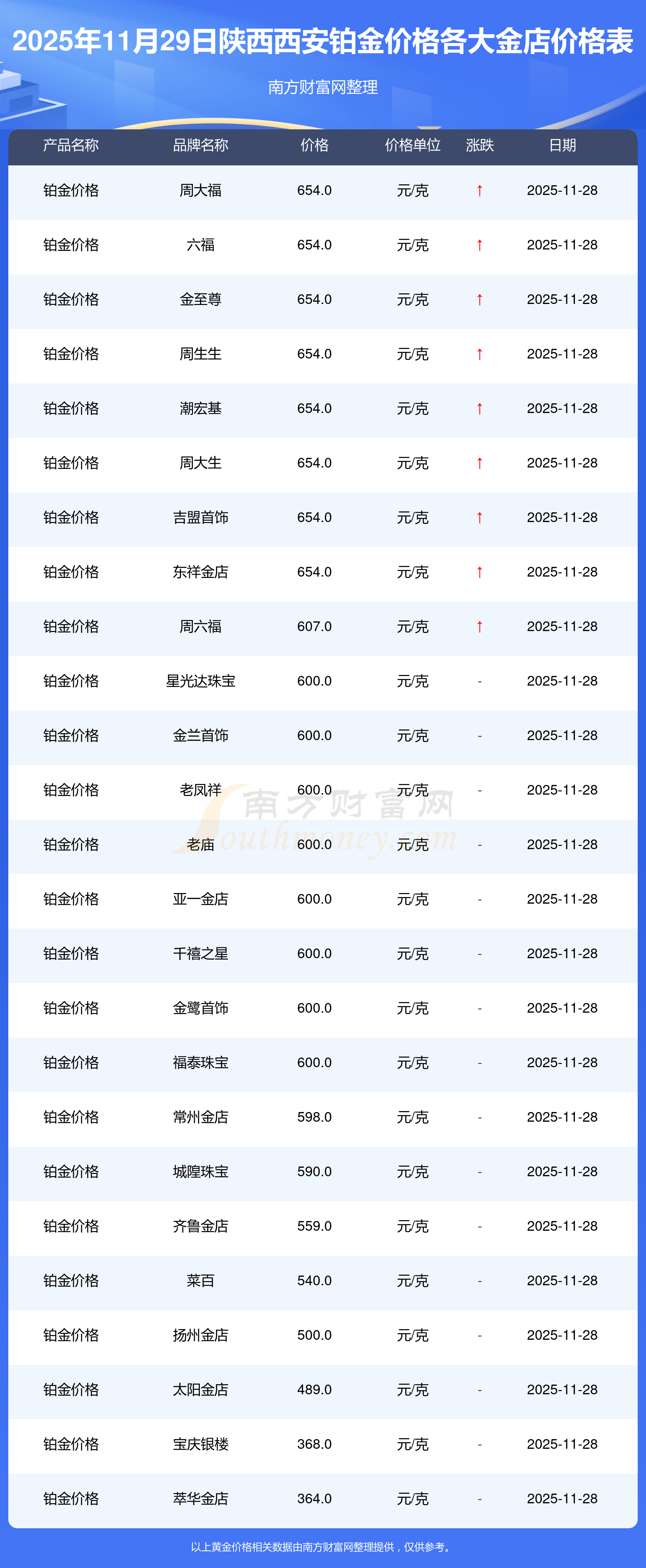 今日陜西西安鉑金價格最低的金店是萃華金店,報(bào)價364.0元/克,最高的是周大福,報(bào)價654.0元/克。今日鉑金價格高低差為290元/克。