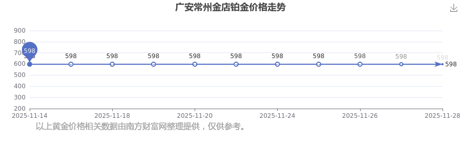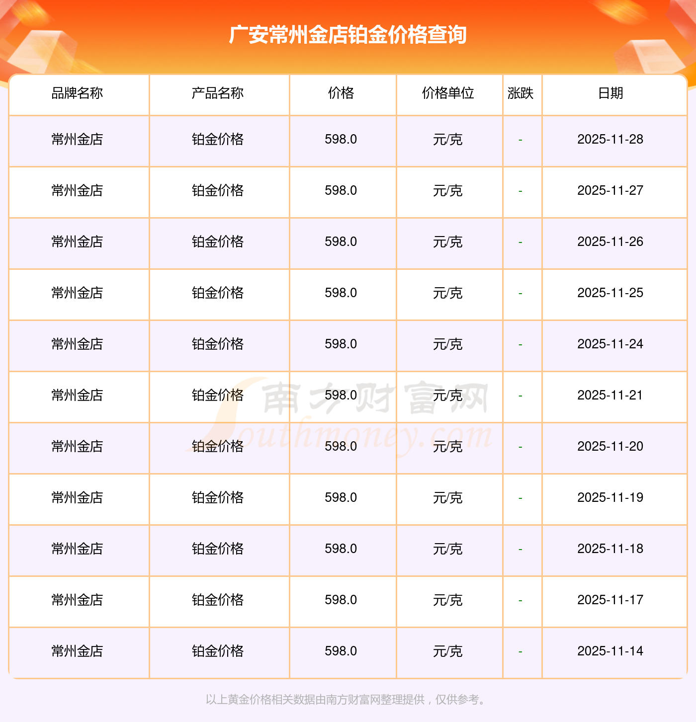今日(2025年11月29日),廣安常州金店鉑金價(jià)格的價(jià)格是598.0元/克。