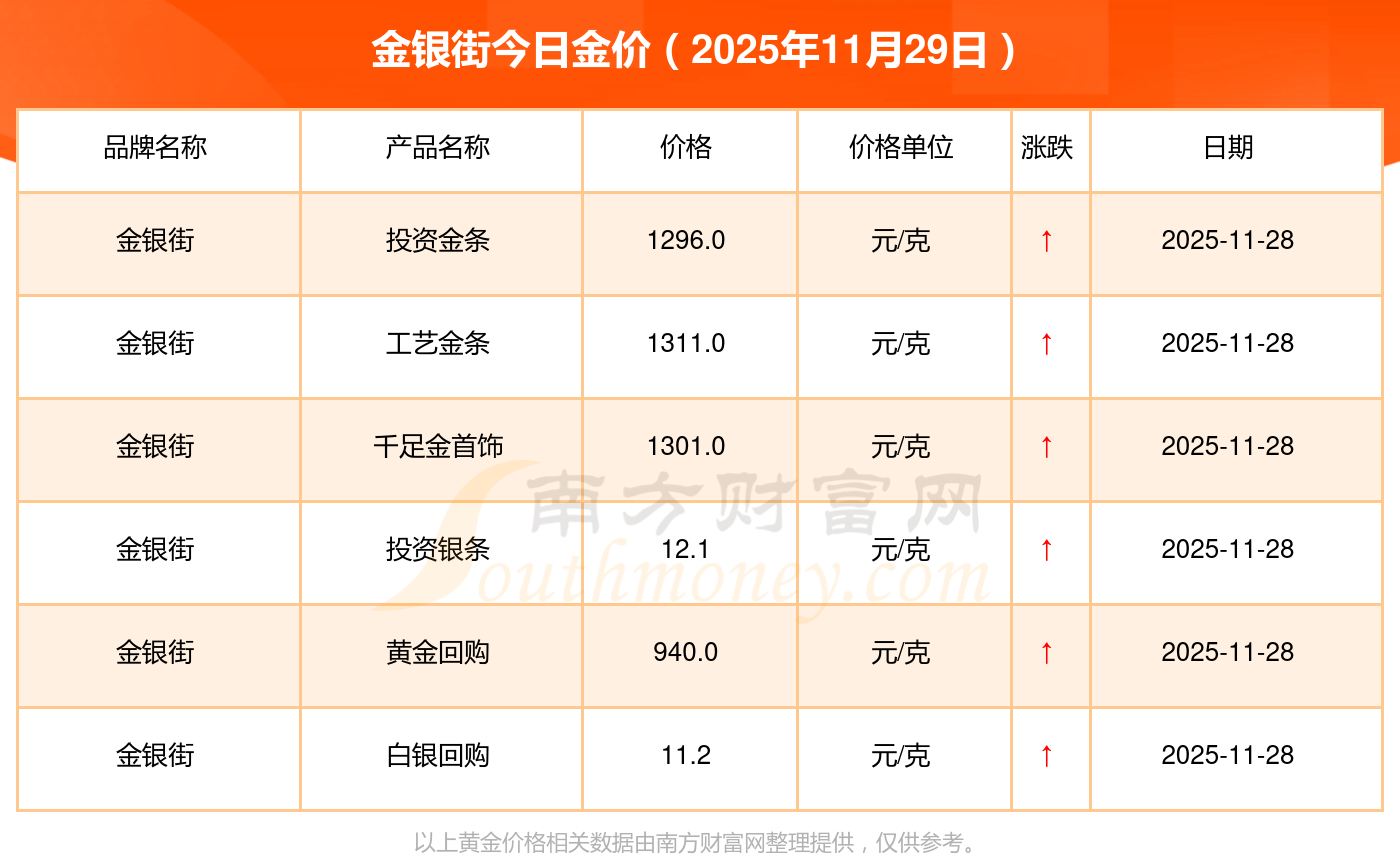 你了解金銀街金價(jià)今日價(jià)格嗎?以下是詳情數(shù)據(jù):黃金價(jià)格1321.0元/克,鉑金價(jià)格600.0元/克,銀條價(jià)格12.6元/克,黃金價(jià)格1321.0元/克,鉑金價(jià)格600.0元/克,金條價(jià)格(內(nèi)地)1207.0元/克,金飾價(jià)格(內(nèi)地)1321.0元/克,黃金飾品(香港)46370.0,鉑金飾品(香港)13970.0,金條金價(jià)(香港)41860.0,投資金條1296.0元/克。