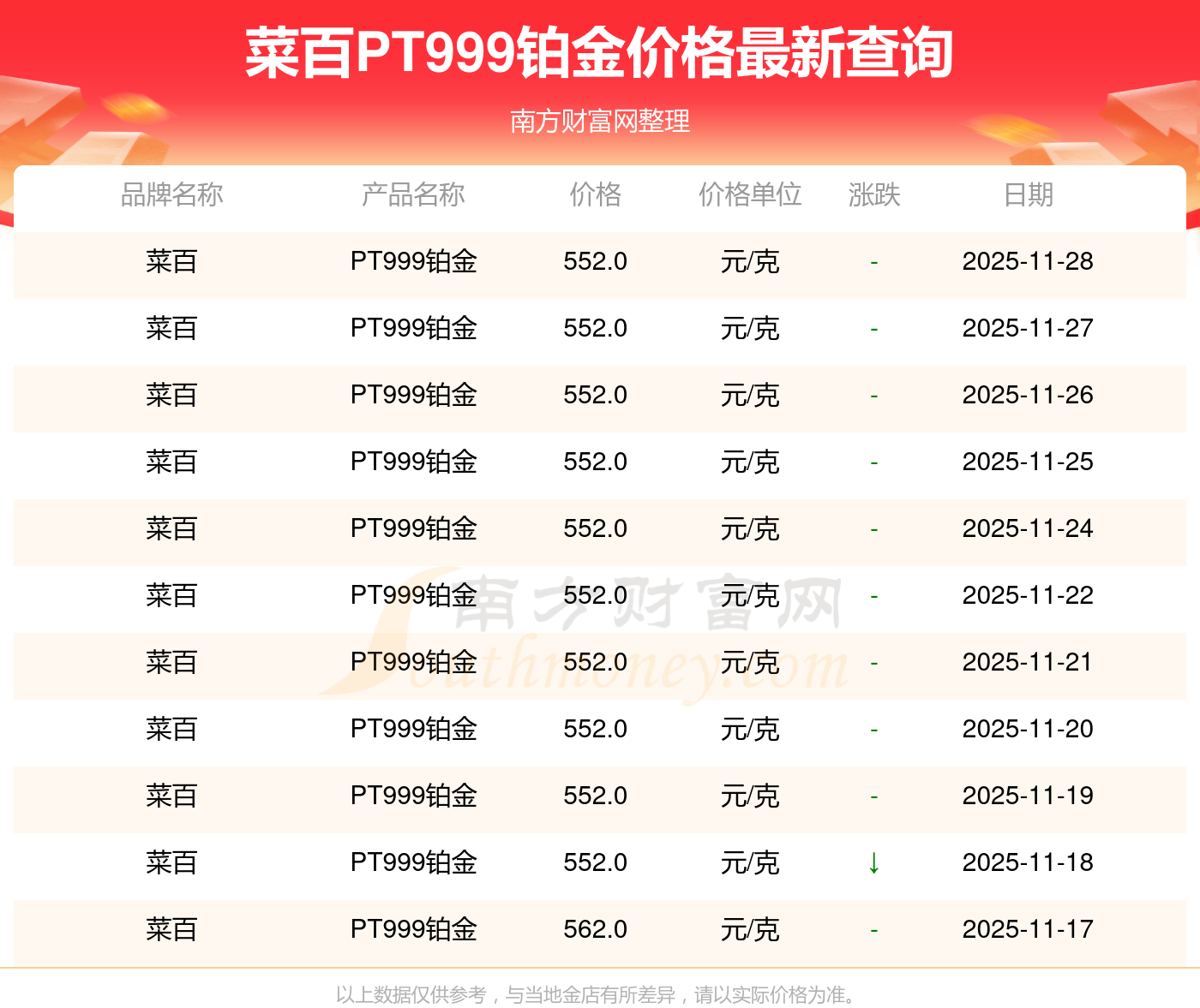 2025年11月29日菜百PT999鉑金價(jià)格最新為552.0元/克。