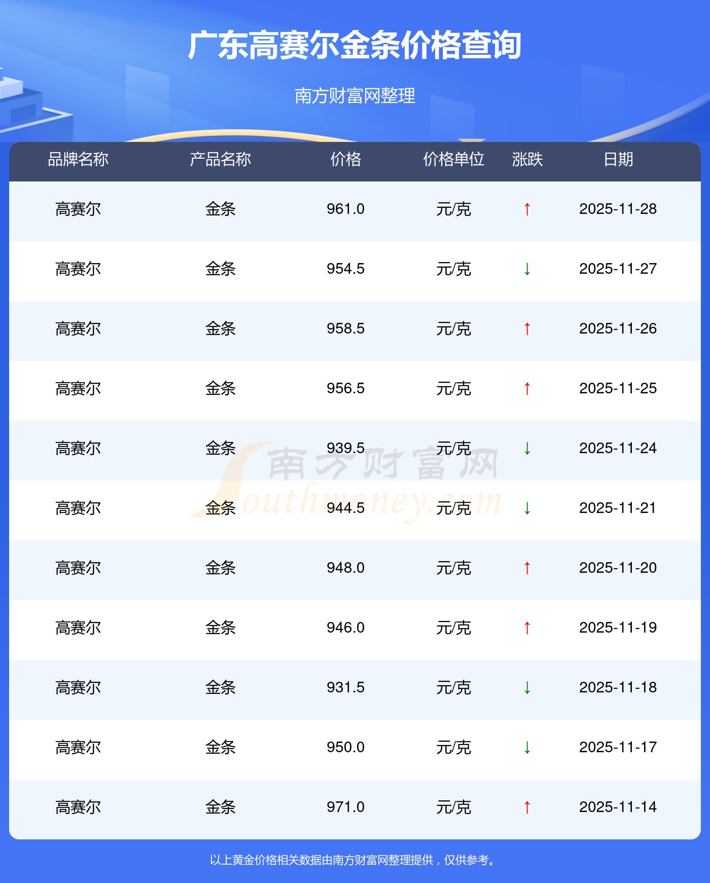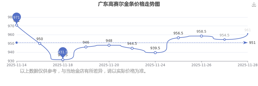 (2025年11月29日)廣東高賽爾金條價(jià)格現(xiàn)在為961.0元/克。