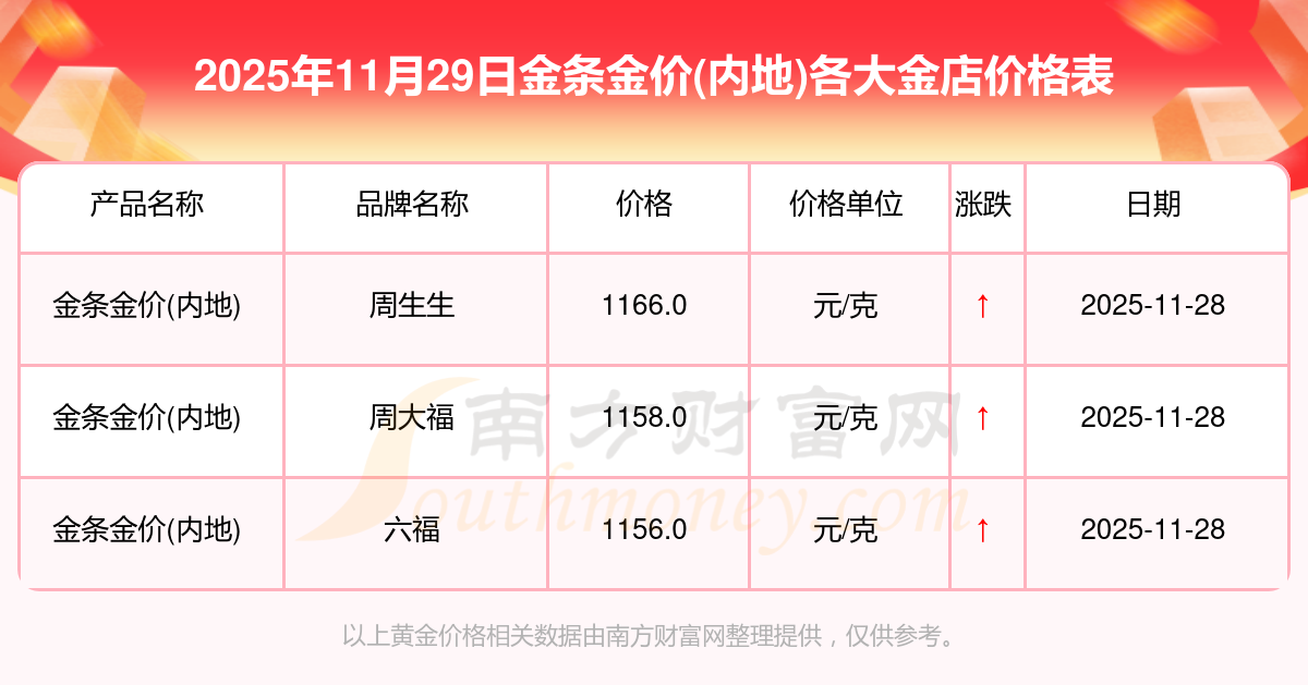 2025年11月29日各大金店金條金價(內(nèi)地)最新價格:星光達(dá)珠寶1321.0元/克,星光達(dá)珠寶600.0元/克,寶泉錢幣12.6元/克,金蘭首飾1321.0元/克,金蘭首飾600.0元/克,謝瑞麟1207.0元/克,謝瑞麟1321.0元/克,謝瑞麟46370.0,謝瑞麟13970.0,謝瑞麟41860.0,金銀街1296.0元/克。