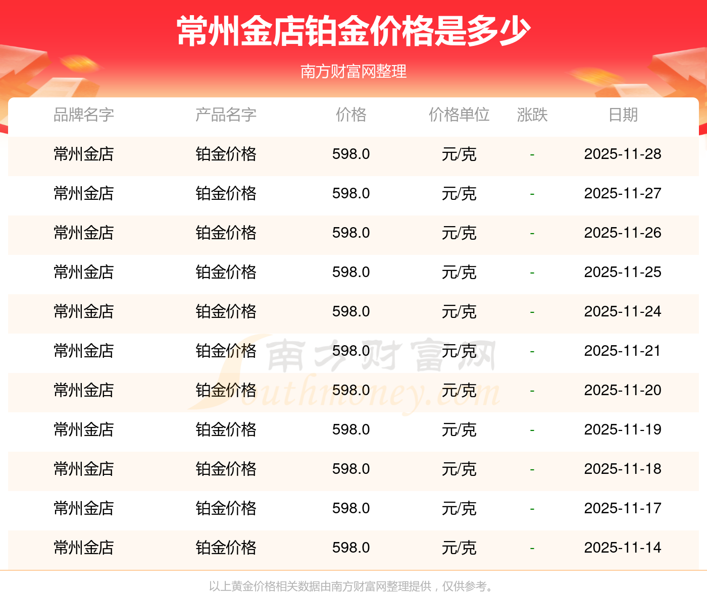 常州金店 鉑金價格在今日的最新價格顯示為598.0元/克。