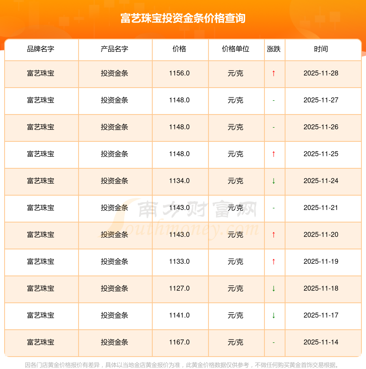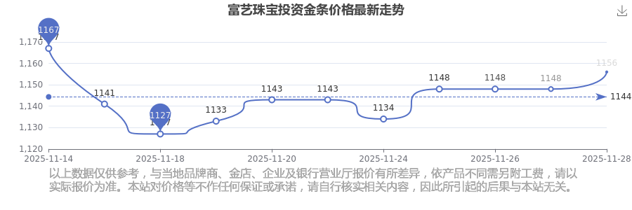 富藝珠寶 投資金條今日最新的價位是1156.0元/克。