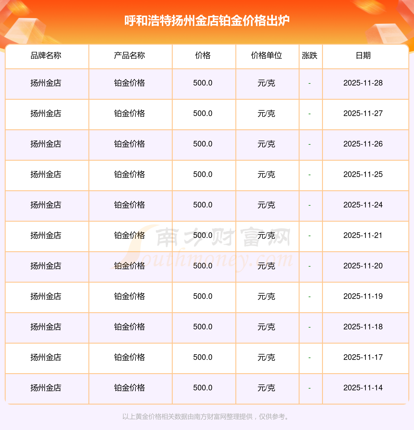 2025年11月29日,呼和浩特?fù)P州金店鉑金價(jià)格每克的售賣價(jià)位為500.0元/克。