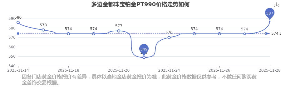 今日多邊金都珠寶鉑金PT990價格是587.0元/克。