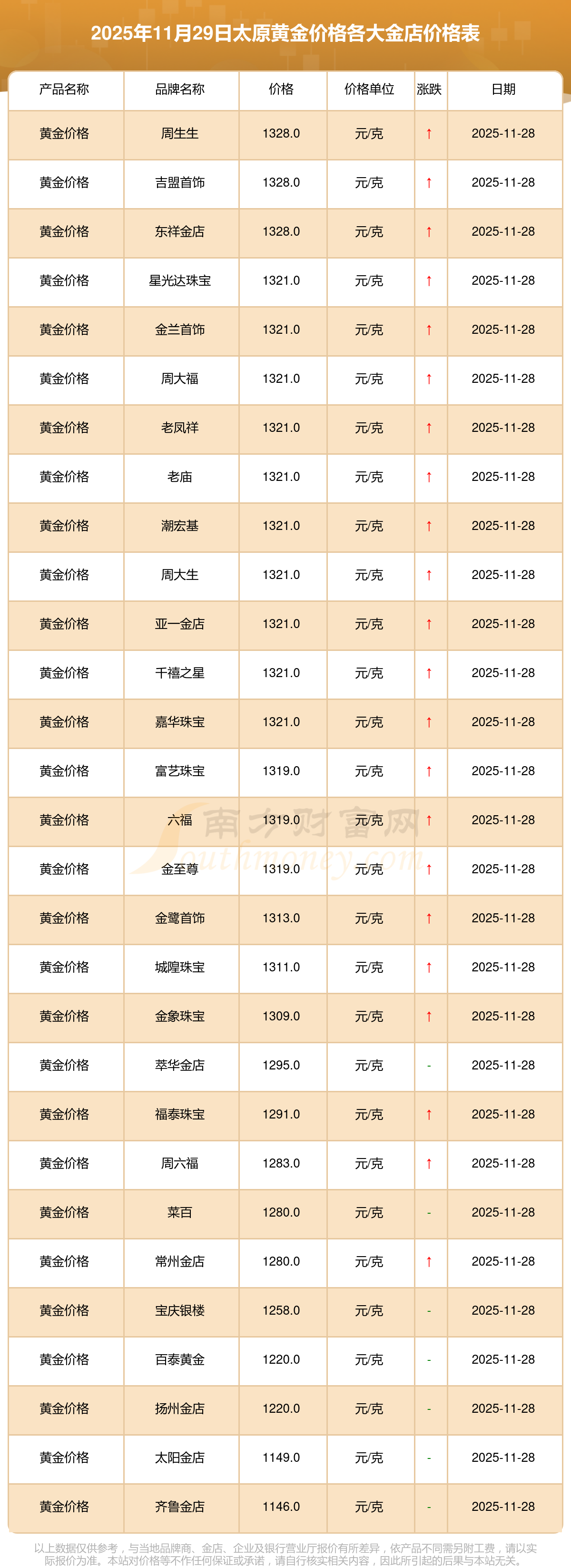 今天是2025年11月29日,太原星光達(dá)珠寶、星光達(dá)珠寶、寶泉錢幣、金蘭首飾、金蘭首飾、謝瑞麟、謝瑞麟、謝瑞麟、謝瑞麟、謝瑞麟、金銀街等各大金店品牌黃金價格最新價格如下:星光達(dá)珠寶1321.0元/克、星光達(dá)珠寶600.0元/克、寶泉錢幣12.6元/克、金蘭首飾1321.0元/克、金蘭首飾600.0元/克、謝瑞麟1207.0元/克、謝瑞麟1321.0元/克、謝瑞麟46370.0、謝瑞麟13970.0、謝瑞麟41860.0、金銀街1296.0元/克。