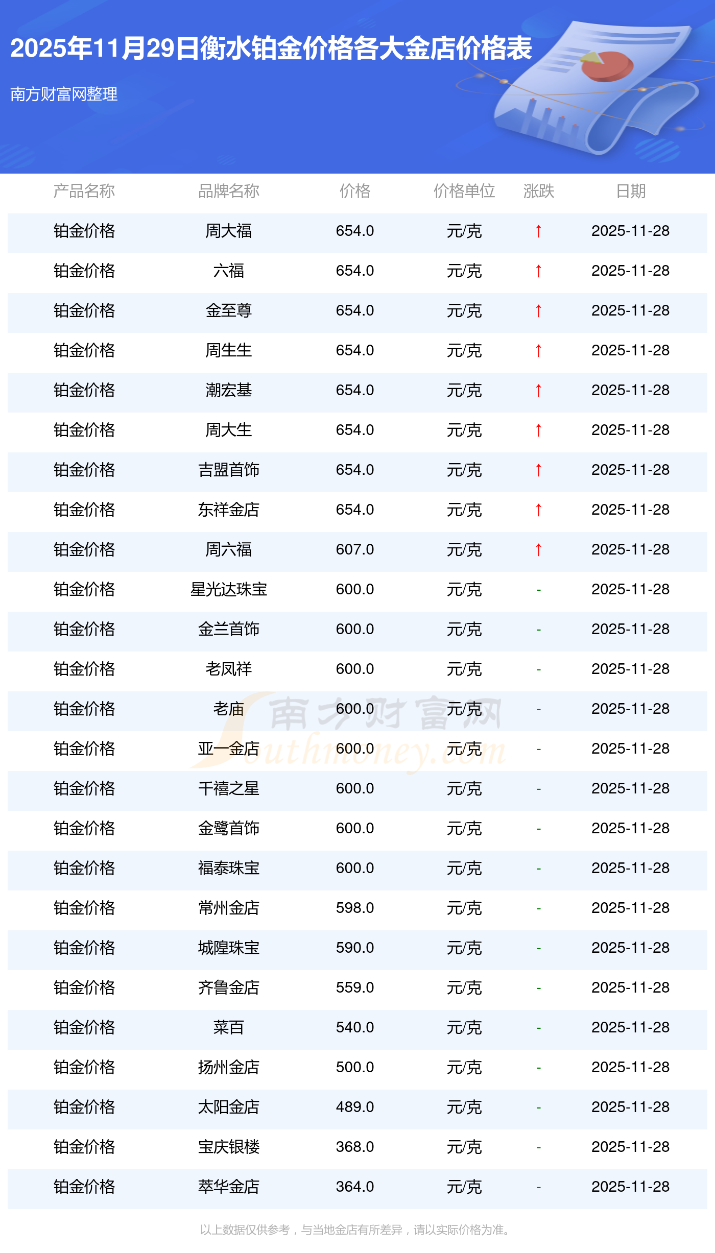 2025年11月29日衡水各大金店鉑金價格最新價格查詢來了:星光達珠寶1321.0元/克,星光達珠寶600.0元/克,寶泉錢幣12.6元/克,金蘭首飾1321.0元/克,金蘭首飾600.0元/克,謝瑞麟1207.0元/克,謝瑞麟1321.0元/克,謝瑞麟46370.0,謝瑞麟13970.0,謝瑞麟41860.0,金銀街1296.0元/克。