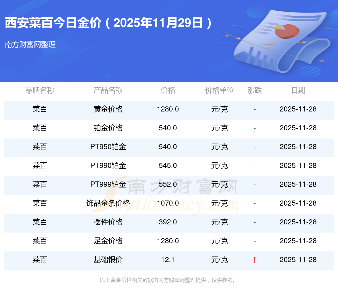 以上數(shù)據(jù)僅供參考,與當?shù)仄放粕、金店、企業(yè)及銀行營業(yè)廳報價有所差異,依產(chǎn)品不同需另附工費,請以實際報價為準。本站對價格等不作任何保證或承諾,請自行核實相關內(nèi)容,因此所引起的后果與本站無關。