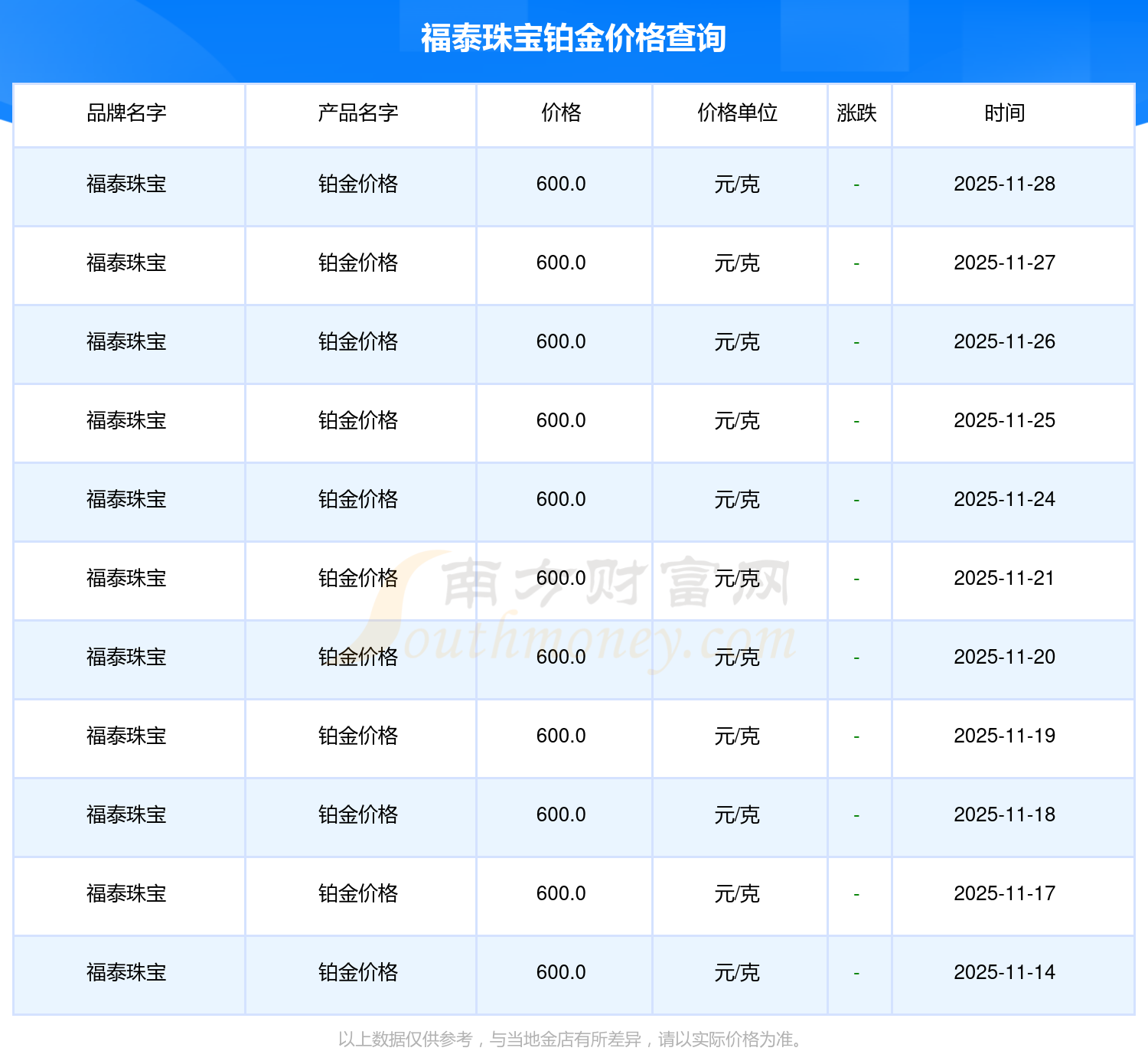 福泰珠寶 鉑金價格在今日更新至600.0元/克。