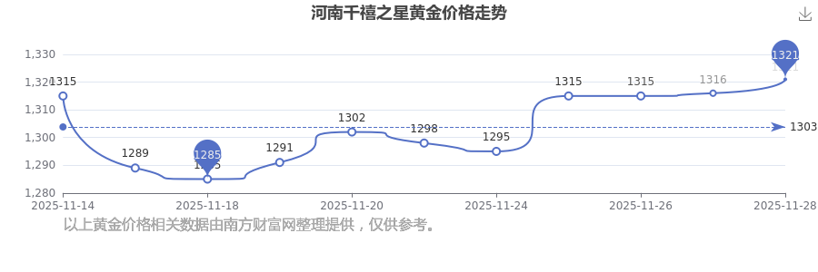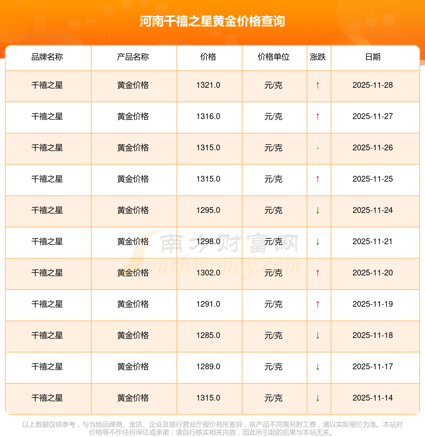 今日(2025年11月29日),河南千禧之星黃金價格:1321.0元/克。