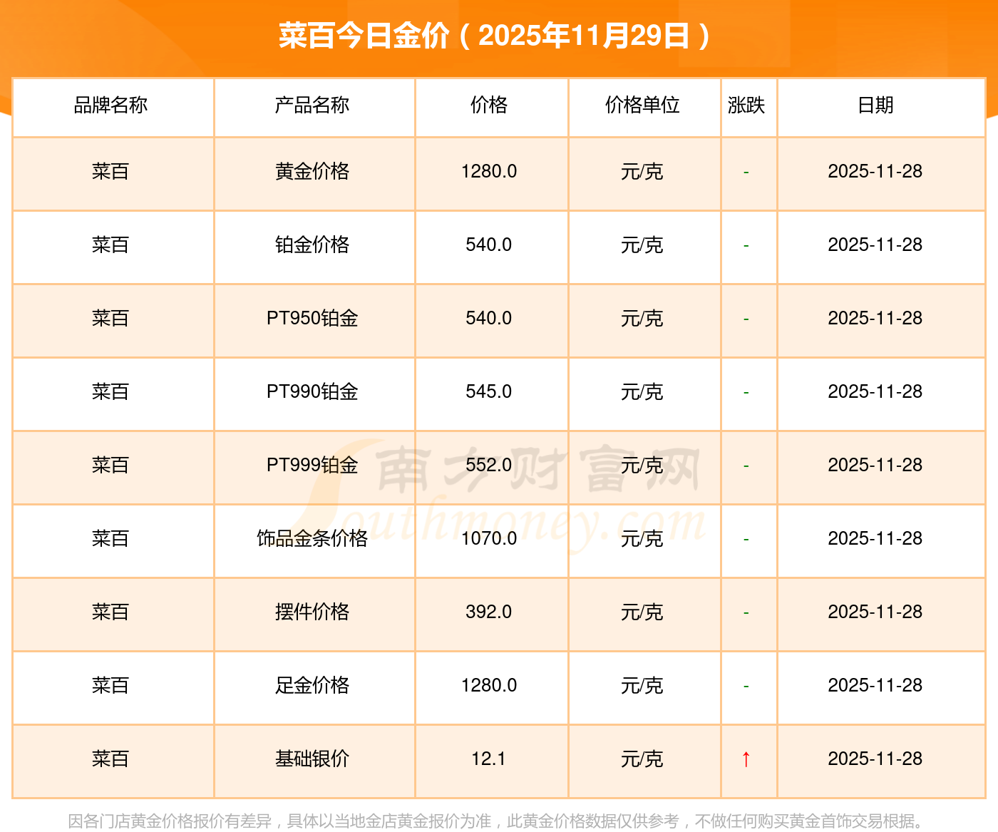 因各門店黃金價(jià)格報(bào)價(jià)有差異,具體以當(dāng)?shù)亟鸬挈S金報(bào)價(jià)為準(zhǔn),此黃金價(jià)格數(shù)據(jù)僅供參考,不做任何購買黃金首飾交易根據(jù)。