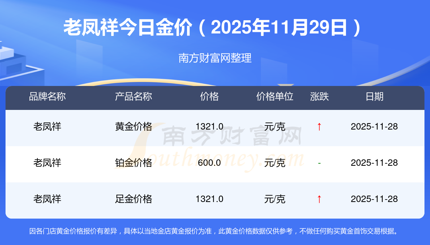 2025年11月29日老鳳祥最新價格:黃金價格1321.0元/克,鉑金價格600.0元/克,銀條價格12.6元/克,黃金價格1321.0元/克,鉑金價格600.0元/克,金條價格(內(nèi)地)1207.0元/克,金飾價格(內(nèi)地)1321.0元/克,黃金飾品(香港)46370.0,鉑金飾品(香港)13970.0,金條金價(香港)41860.0,投資金條1296.0元/克。