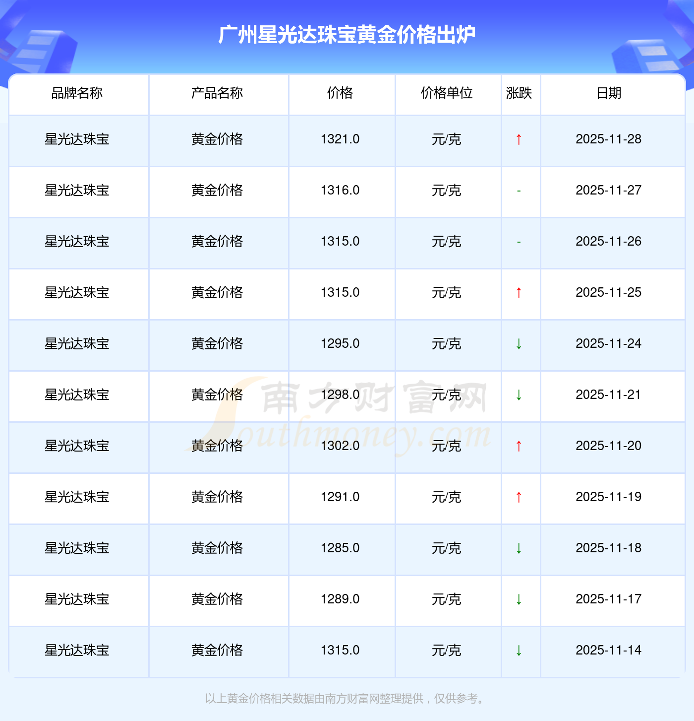 (2025年11月29日)今日廣州星光達珠寶黃金價格是1321.0元/克。