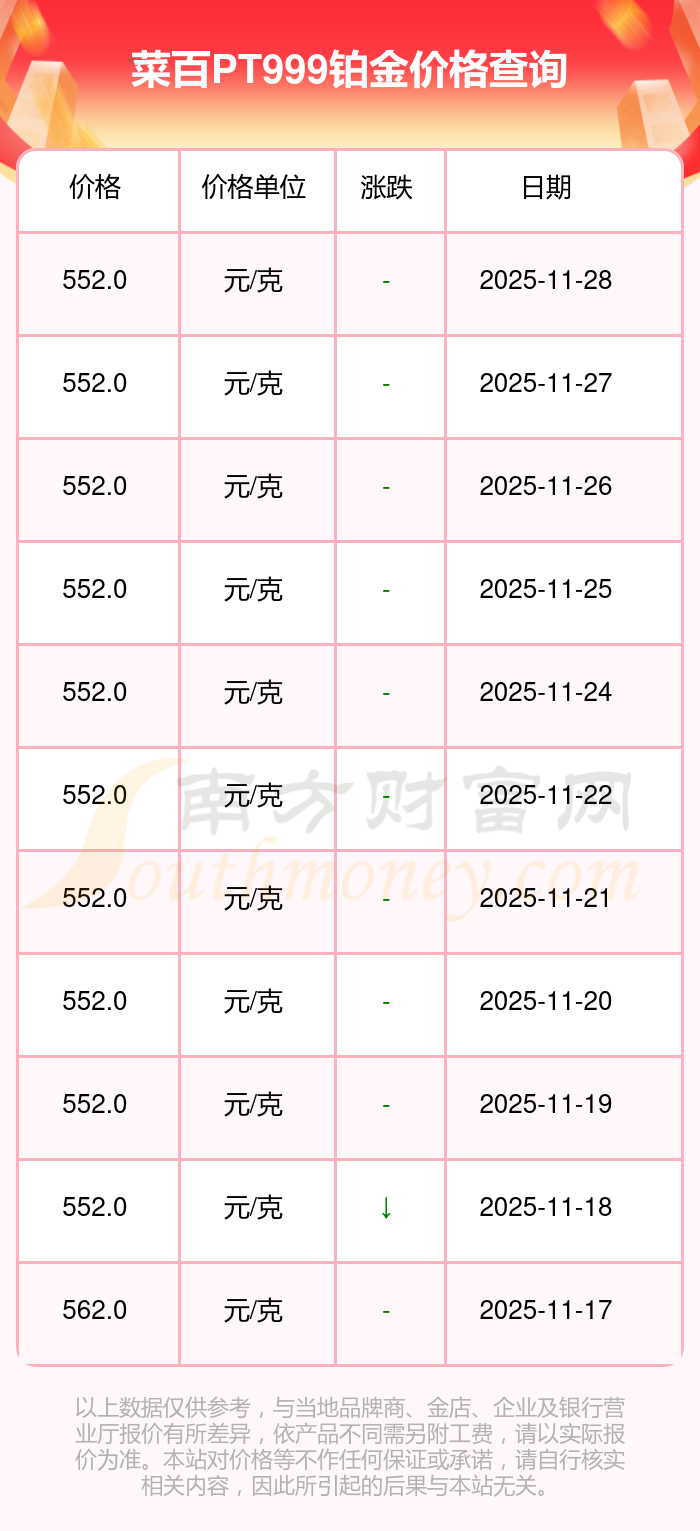 今日菜百PT999鉑金價(jià)格為552.0元/克。