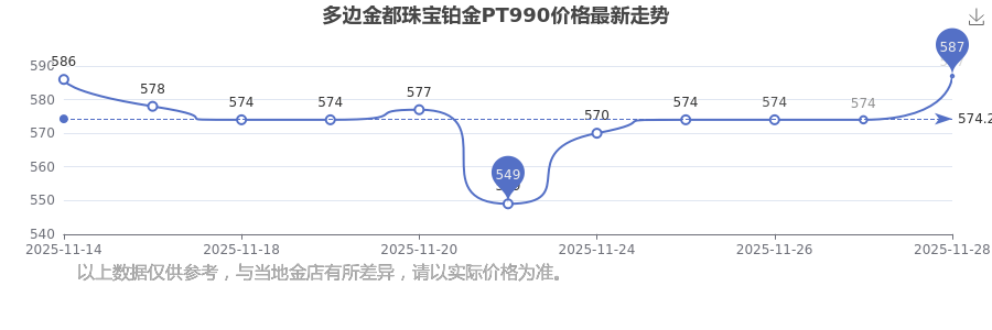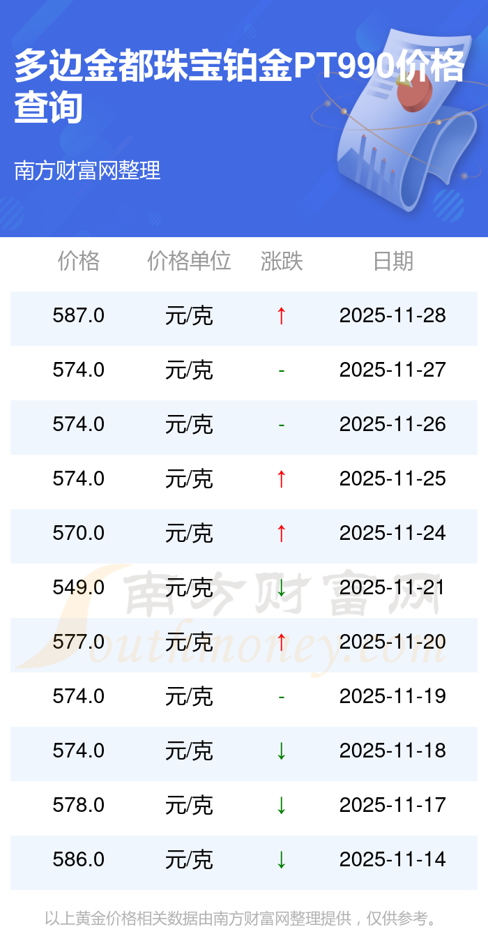 多邊金都珠寶 鉑金PT990今日最新的價(jià)位是587.0元/克。