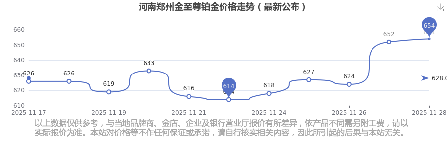 今日(2025年11月29日),河南鄭州金至尊鉑金價格:654.0元/克。