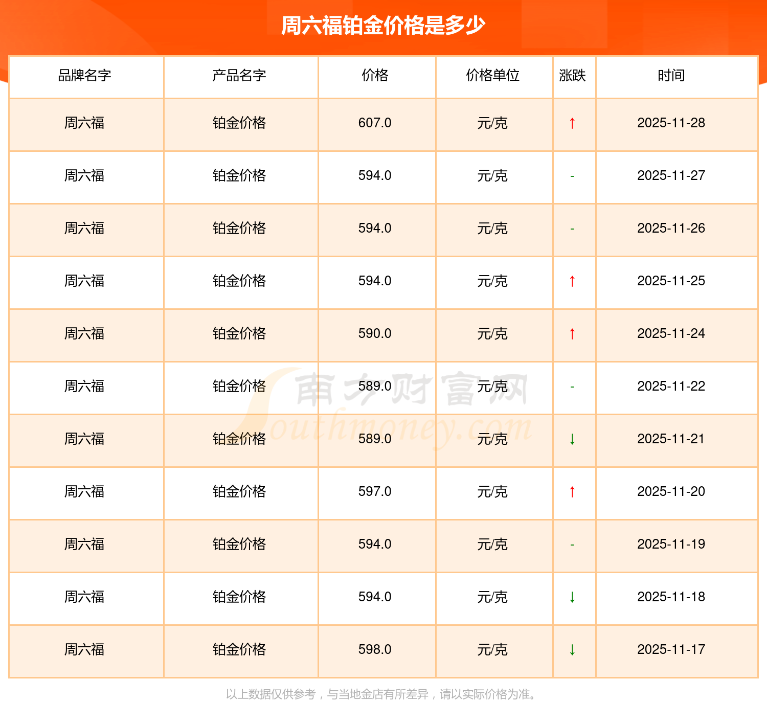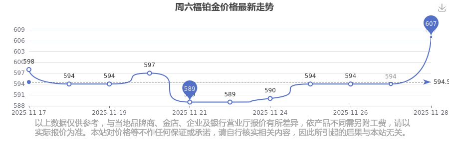 今日周六福鉑金價格是607.0元/克。
