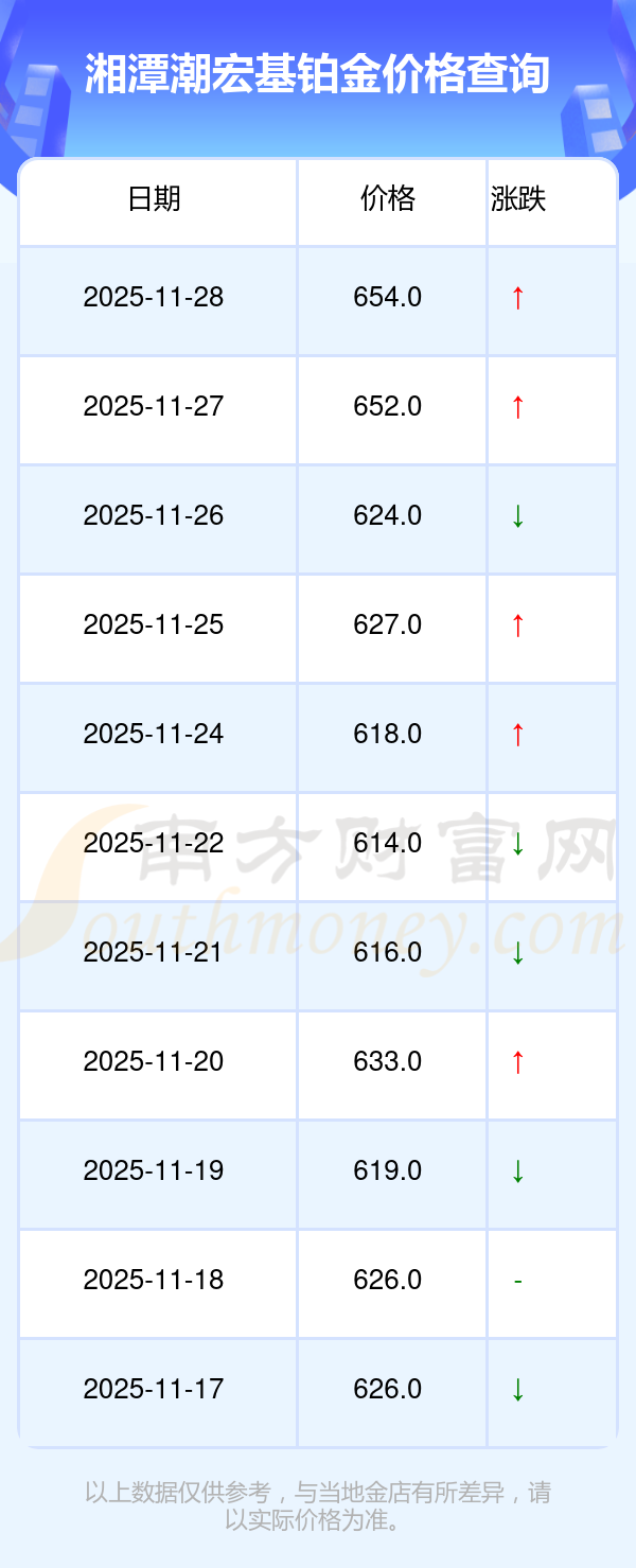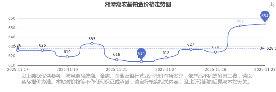 今日(2025年11月29日)湘潭潮宏基鉑金價格最新價格為654.0元/克。