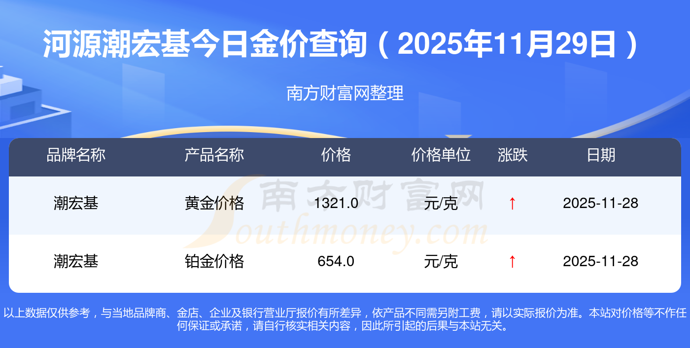 今日黃金價(jià)格查詢_現(xiàn)在金價(jià)黃金一克多少錢,黃金價(jià)格是多少錢一克?2025年11月29日河源潮宏基金價(jià)查詢:黃金價(jià)格1321.0元/克,鉑金價(jià)格600.0元/克,銀條價(jià)格12.6元/克,黃金價(jià)格1321.0元/克,鉑金價(jià)格600.0元/克,金條價(jià)格(內(nèi)地)1207.0元/克,金飾價(jià)格(內(nèi)地)1321.0元/克,黃金飾品(香港)46370.0,鉑金飾品(香港)13970.0,金條金價(jià)(香港)41860.0,投資金條1296.0元/克。