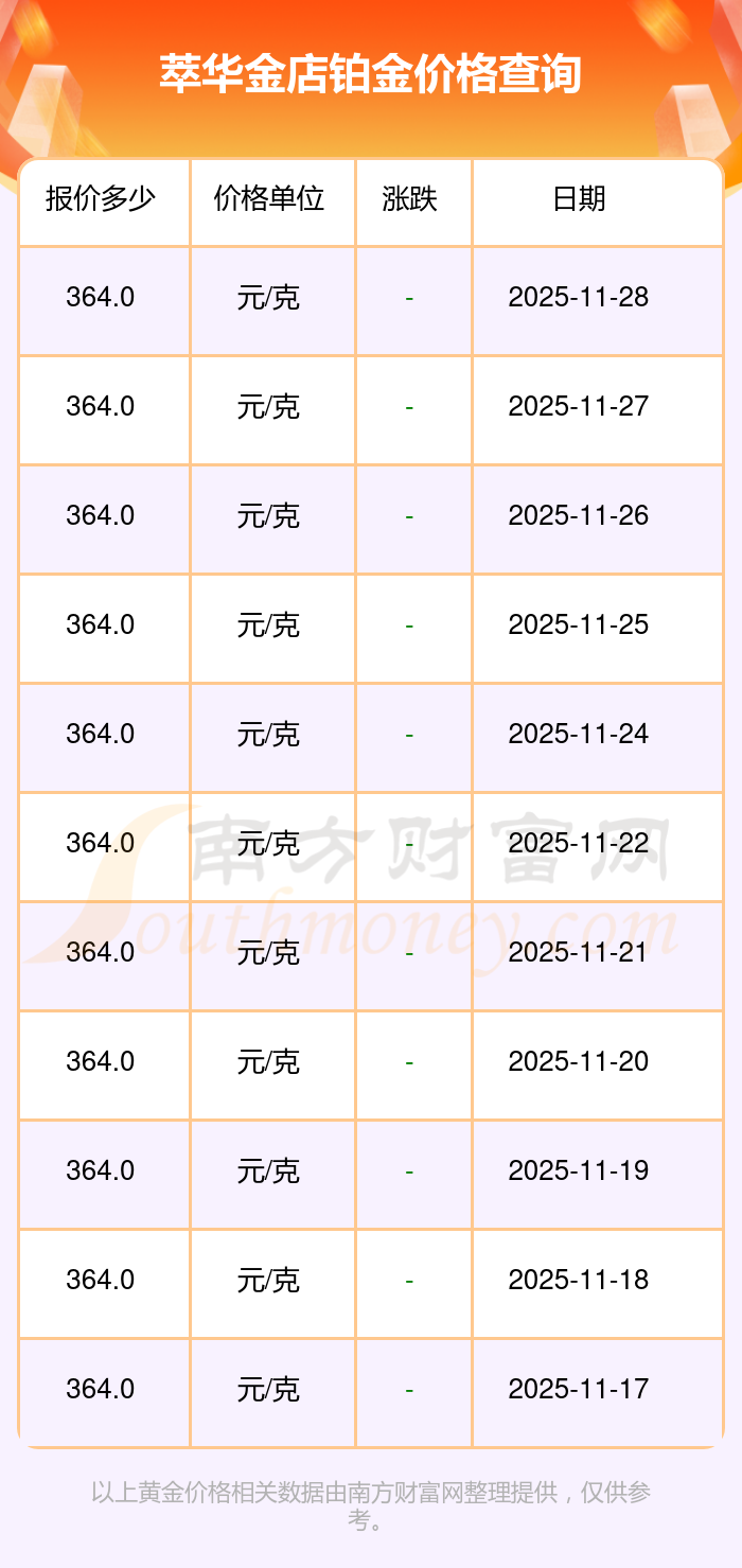 今日(2025年11月29日),萃華金店鉑金價格最新價格是364.0元/克。