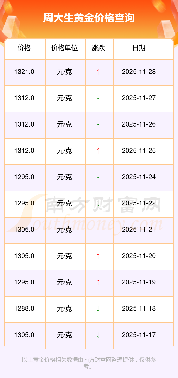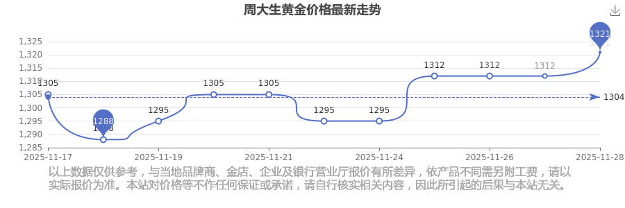 最新數(shù)據(jù)表明,周大生今日 黃金價(jià)格為1321.0元/克。
