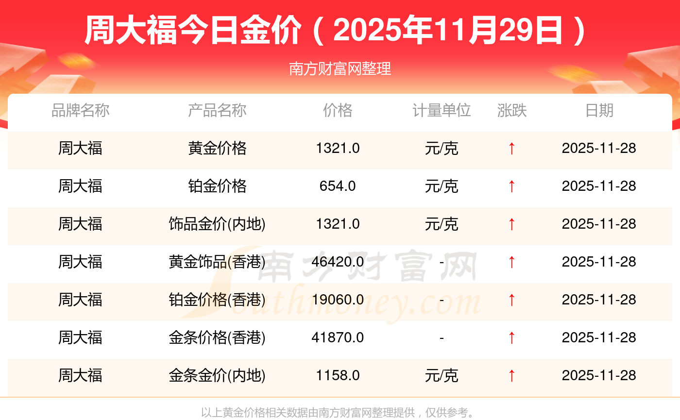 周大福今日黃金價(jià)格行情如何:黃金價(jià)格1321.0元/克,鉑金價(jià)格600.0元/克,銀條價(jià)格12.6元/克,黃金價(jià)格1321.0元/克,鉑金價(jià)格600.0元/克,金條價(jià)格(內(nèi)地)1207.0元/克,金飾價(jià)格(內(nèi)地)1321.0元/克,黃金飾品(香港)46370.0,鉑金飾品(香港)13970.0,金條金價(jià)(香港)41860.0,投資金條1296.0元/克。