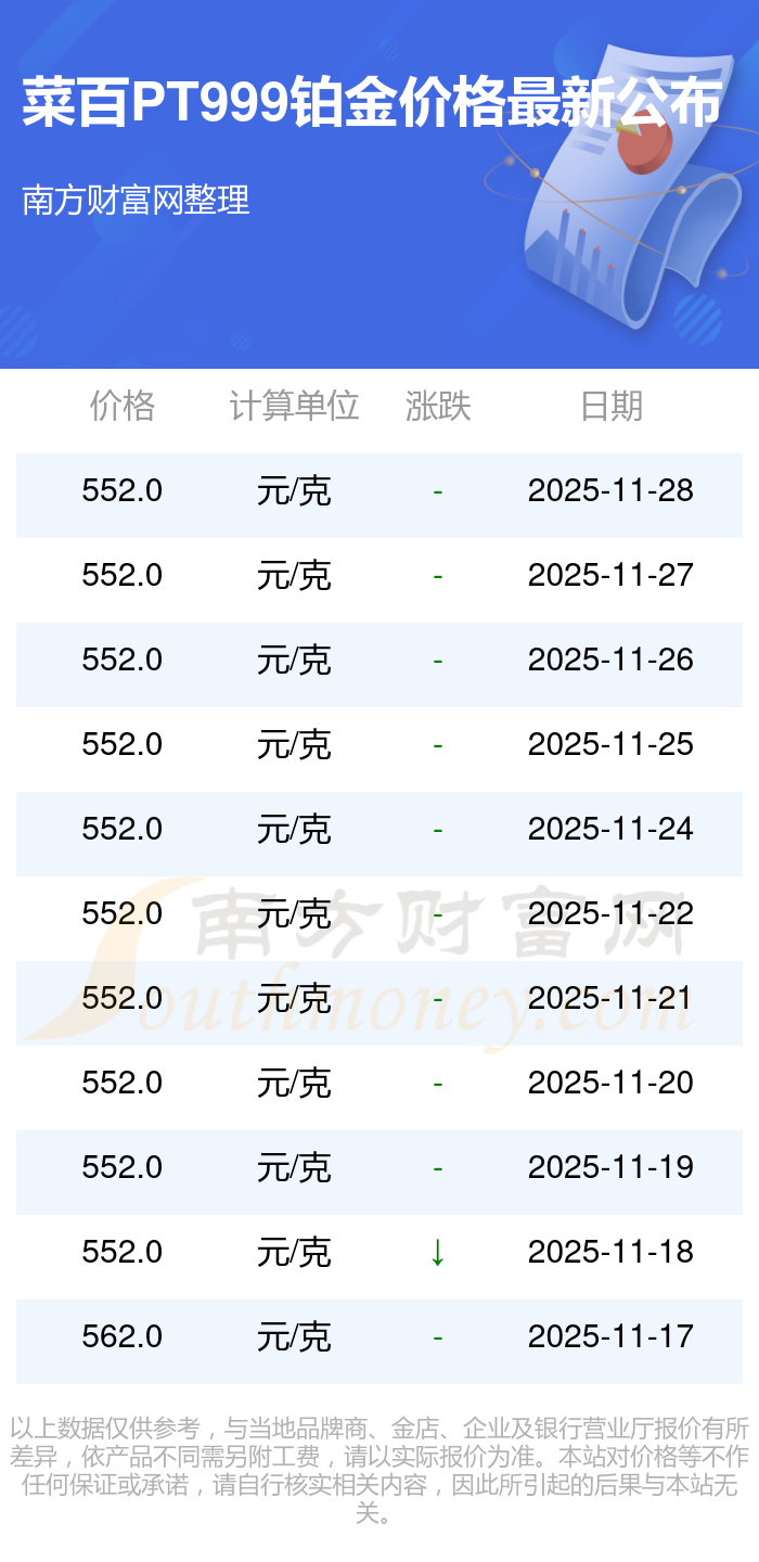 今日菜百PT999鉑金價格最新為552.0元/克。